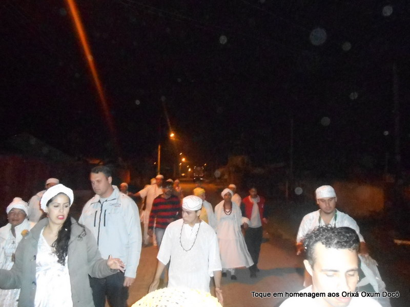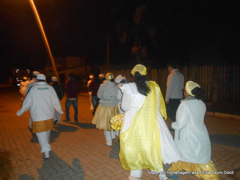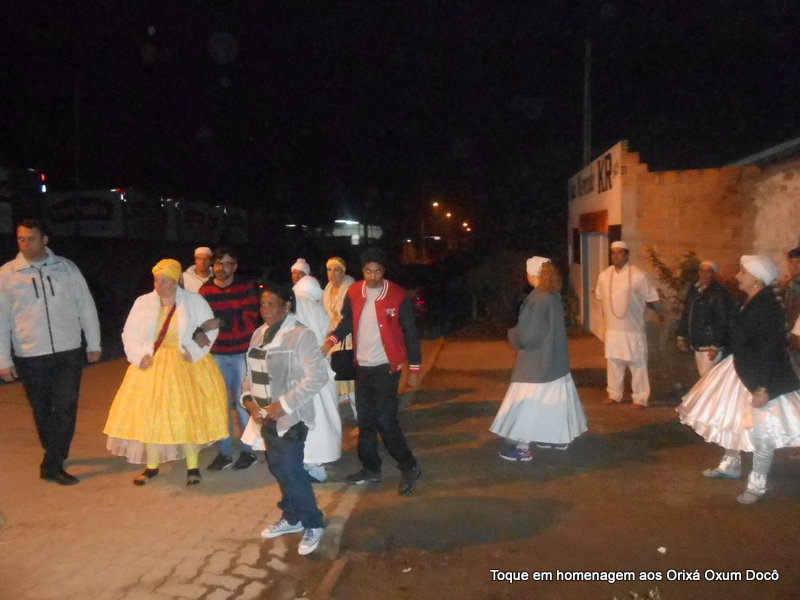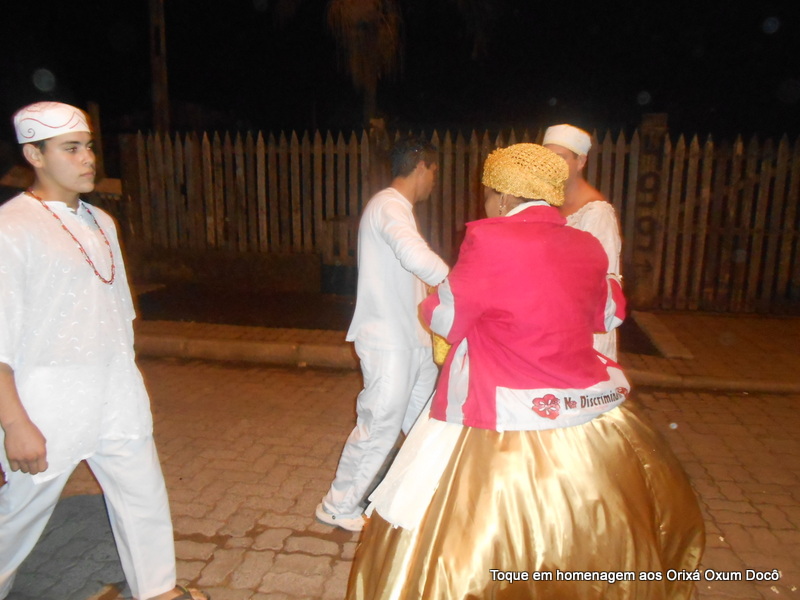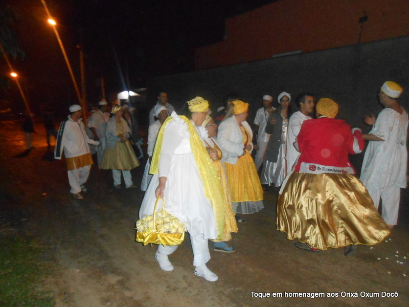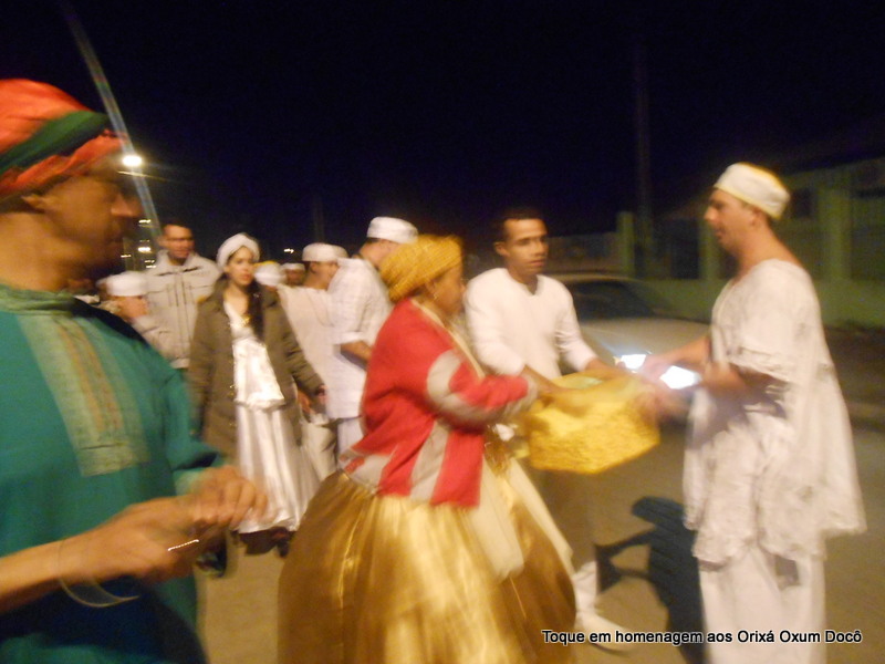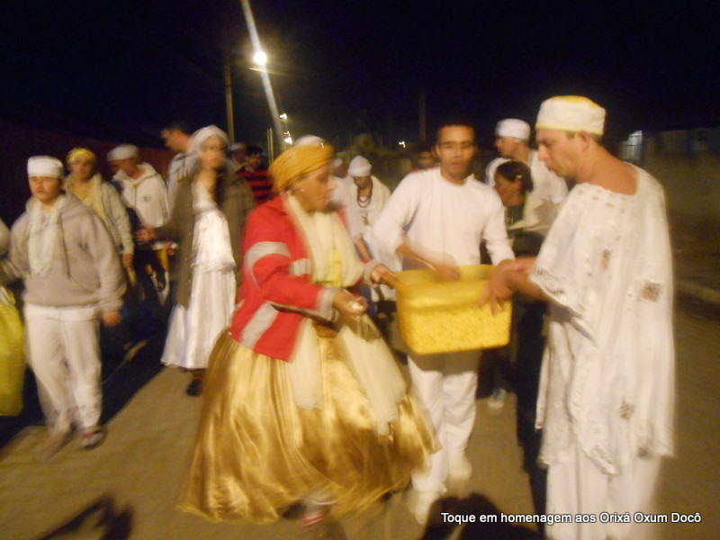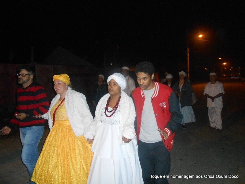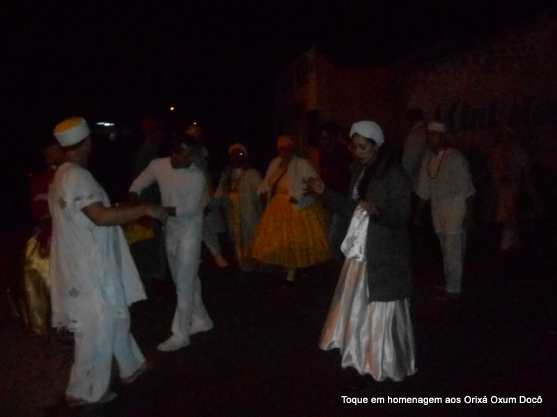 Mãe Carmem de Oxum Docô, acompanhada de seu Pai Alexandre de Oya Tofã, seus irmãos do axé Ilê Orixá Ogum Adioko e Oya Tofã e de Pai Ronie de Ogum realizaram a saudação ao orixá Bará na rua, dando início desta forma a cerimônia de início do Toque em Homenagem ao Orixá Oxum Docô.
