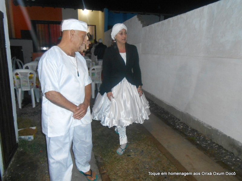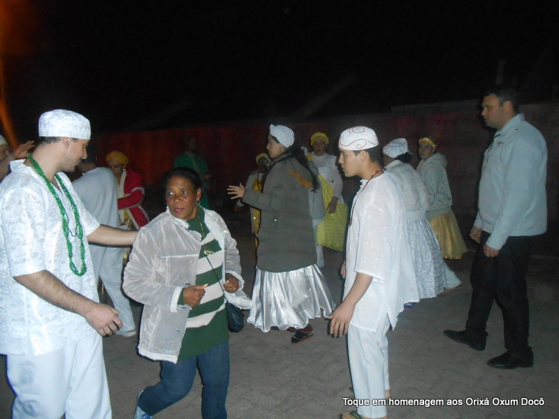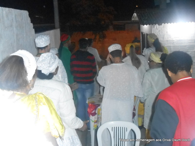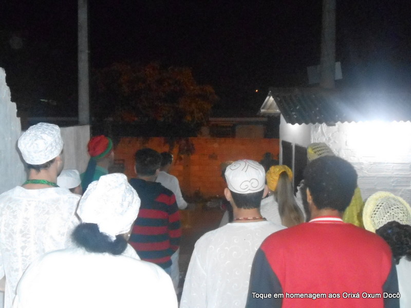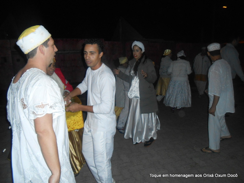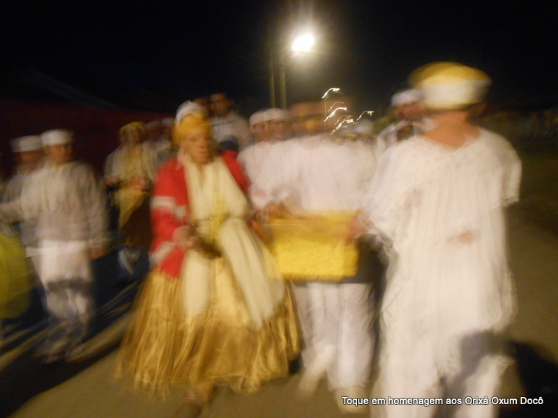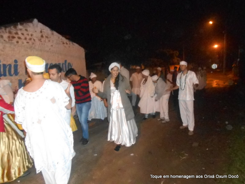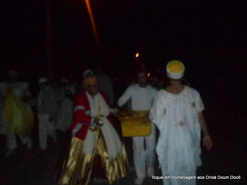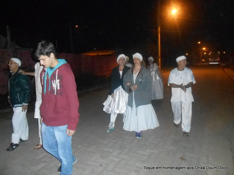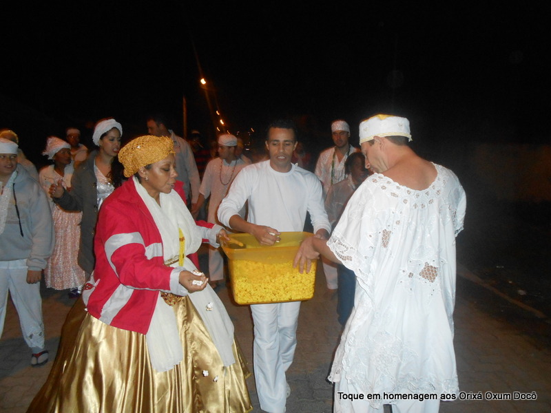 Mãe Carmem de Oxum Docô, acompanhada de seu Pai Alexandre de Oya Tofã, seus irmãos do axé Ilê Orixá Ogum Adioko e Oya Tofã e de Pai Ronie de Ogum realizaram a saudação ao orixá Bará na rua, dando início desta forma a cerimônia de início do Toque em Homenagem ao Orixá Oxum Docô.