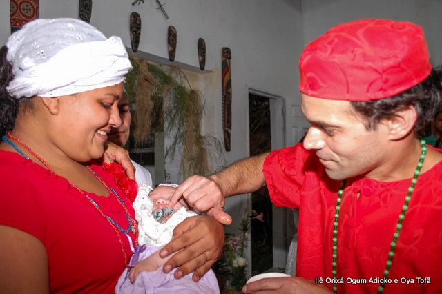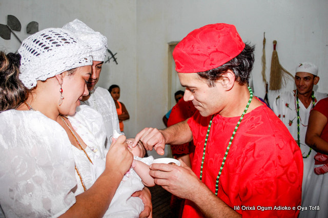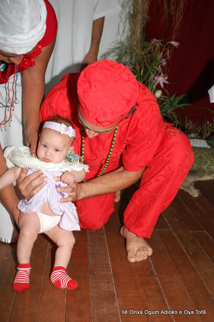 O ritual de batismo, consiste em apresentar as crianças aos Orixás, e a elementos sagrados, dotados de axé. Cada elemento é apresentado a criança após a leitura de de textos que em geral desejam felicidade, saúde, fartura e prosperidade a criança. Segue abaixo o texto que foi lido para a apresentação de batismo nas crianças: