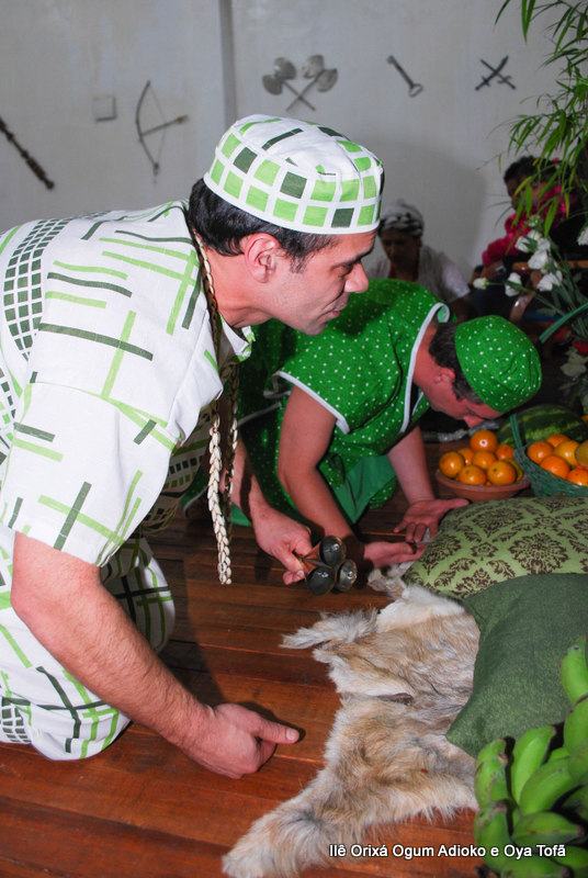 Pai Ronie de Ogum e Pai Alexandre de Oya saudaram seus orixás com muita tranquilidade e respeito, e pedindo que o axé da obrigação seja estendido a todos os presentes, levando saúde, paz, harmonia e felicidade.