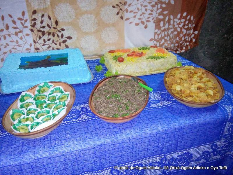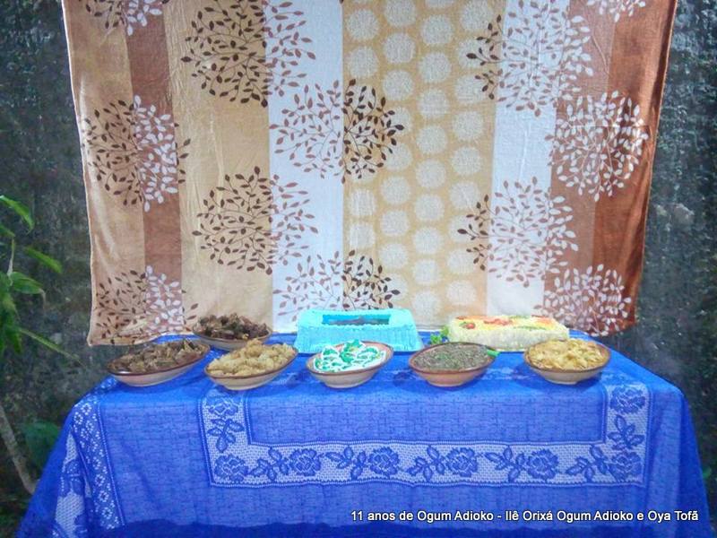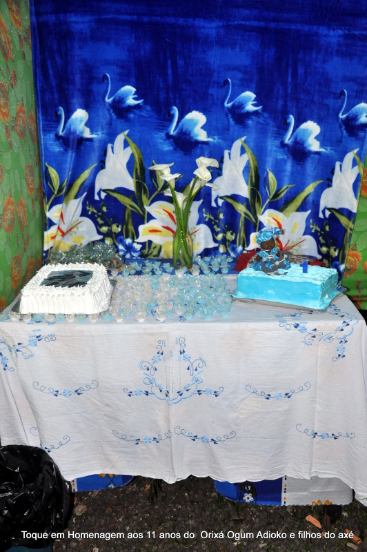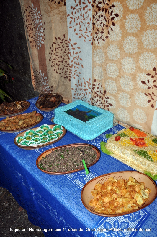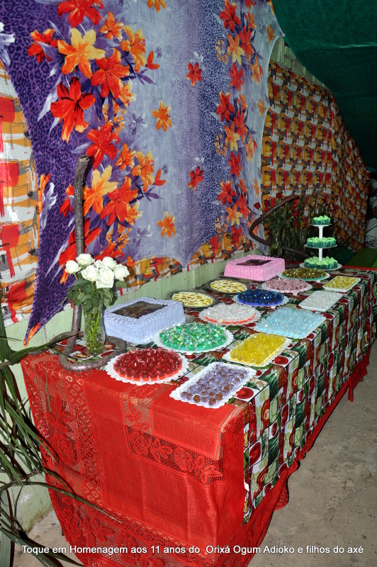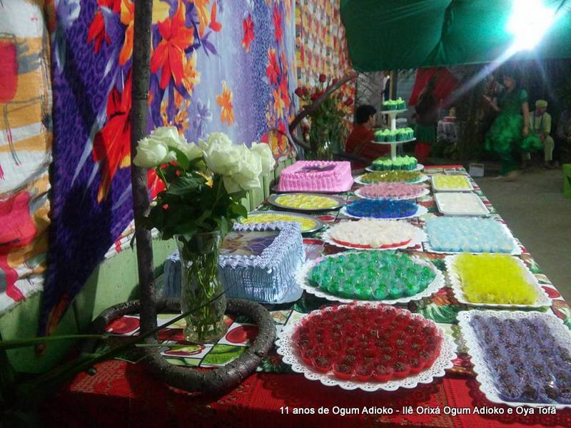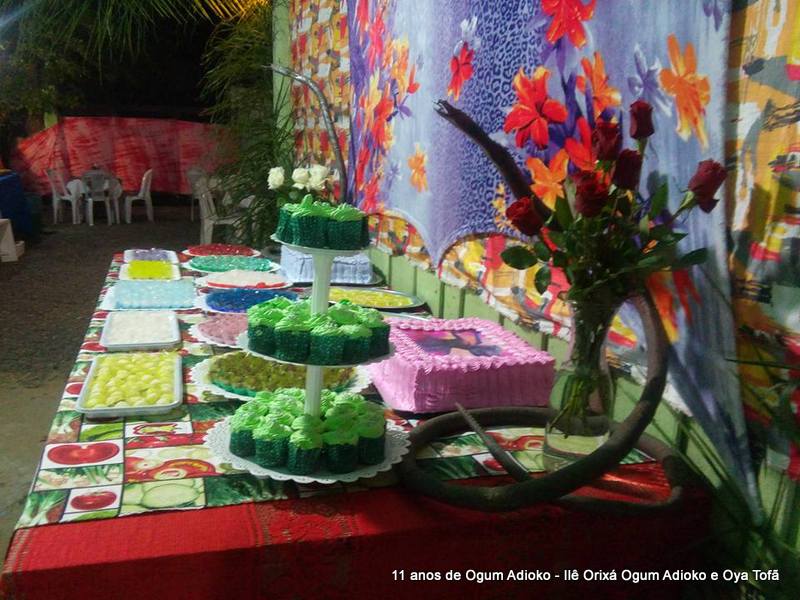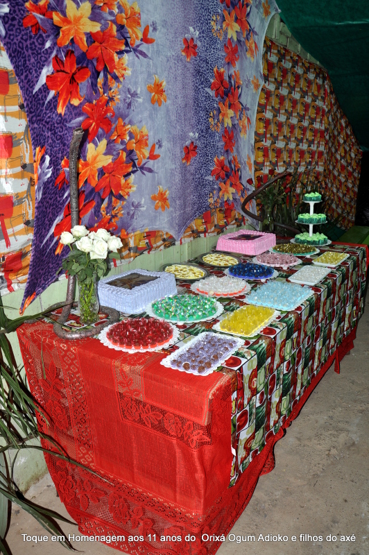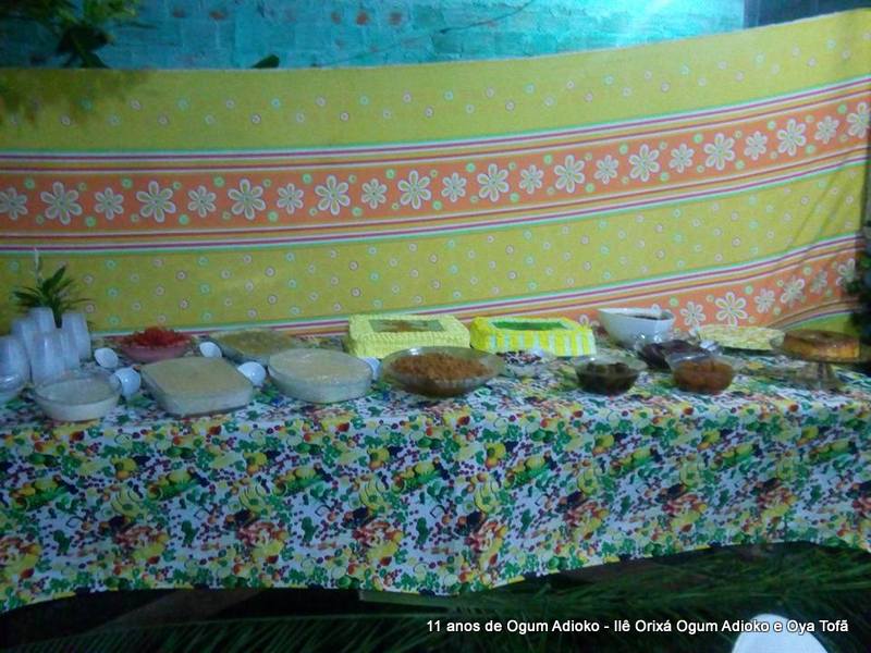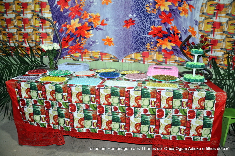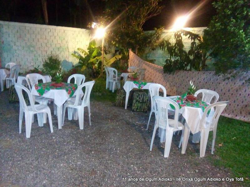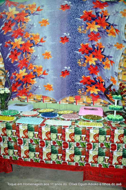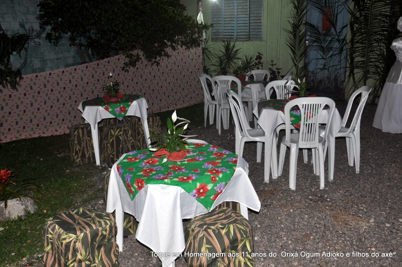 A decoração das mesas associada ao verde da vegetação que existe no Ilê Orixá, além de muitos galhos que são utilizados como parte da decoração faz com que nos sintamos com uma festa no meio da mata, na terra, na presença de todos os orixás, pois orixá esta associado a natureza, não existe orixá sem folha.