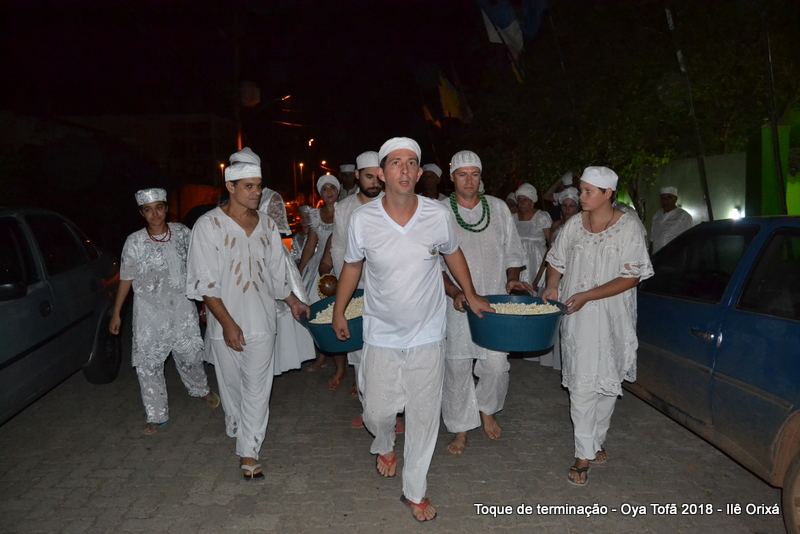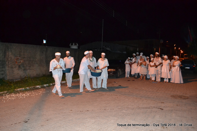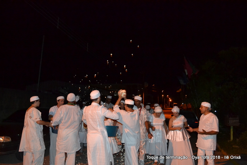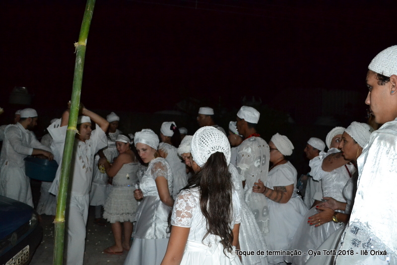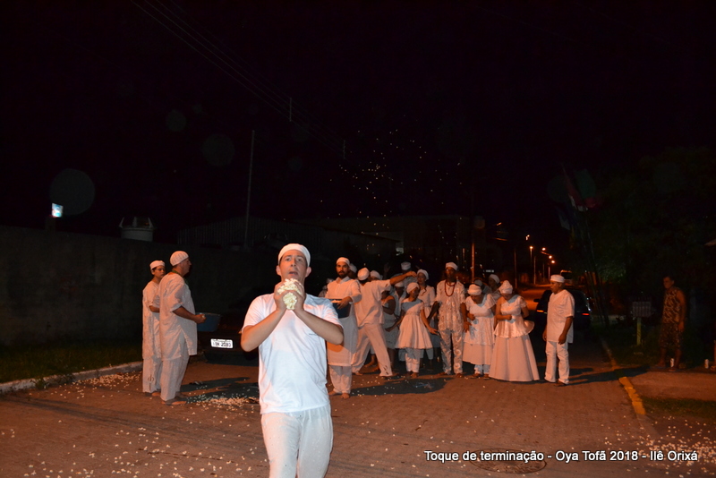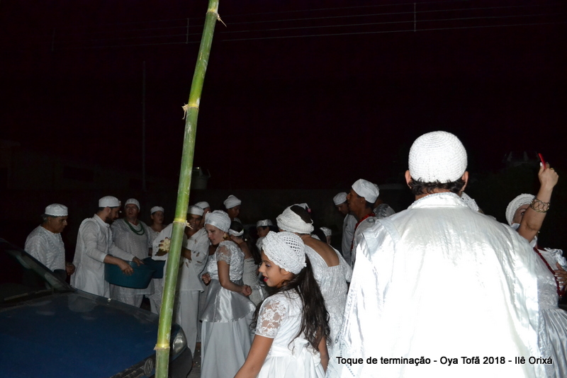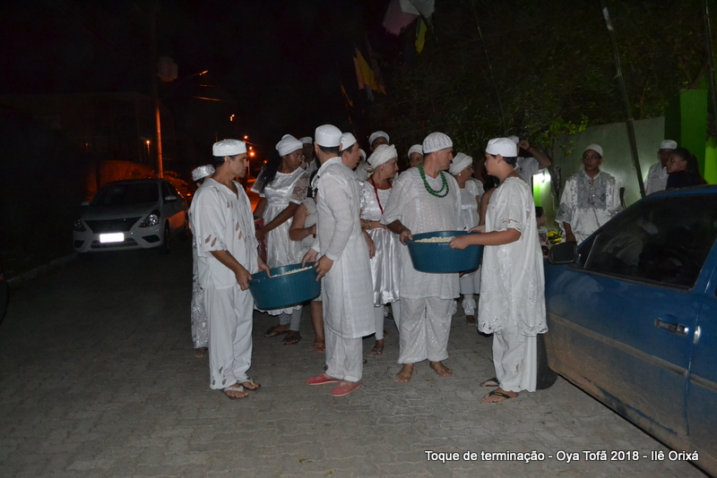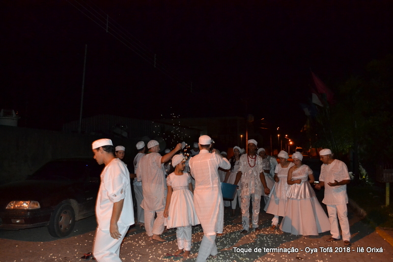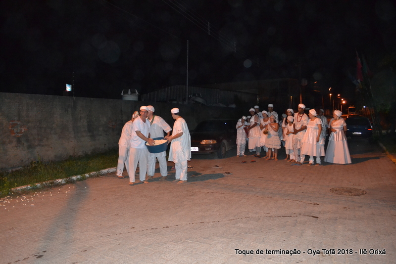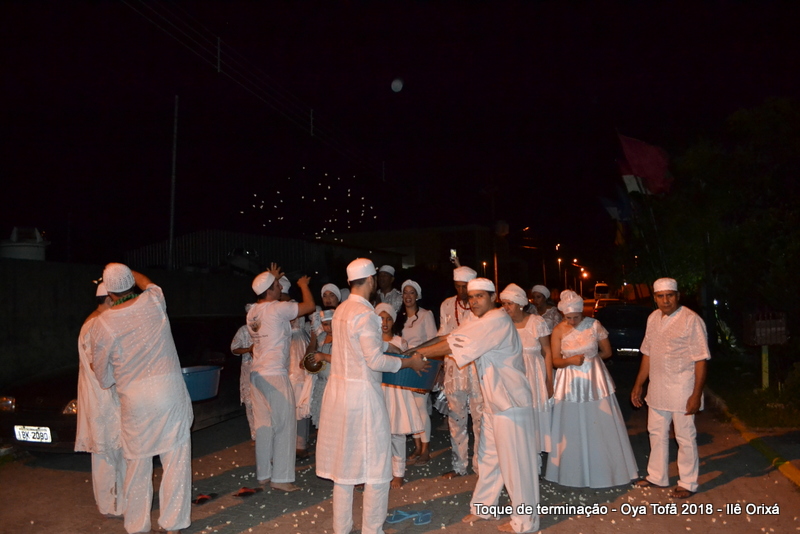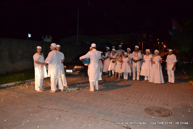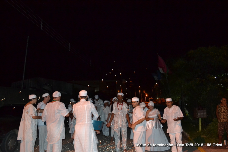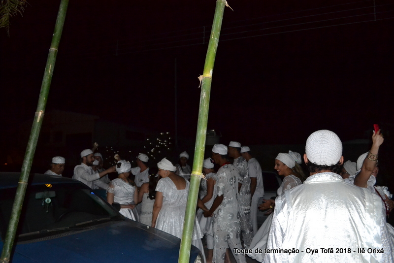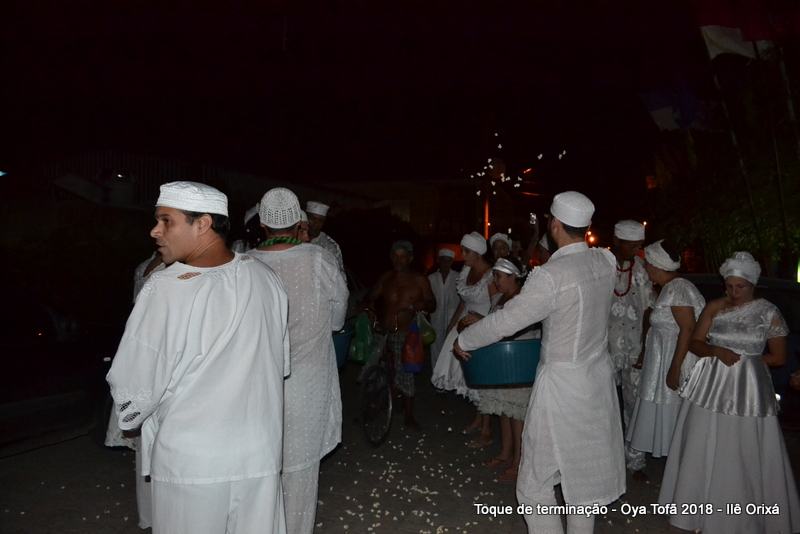 Todos de branco, prontos para o início da cerimônia do toque de terminação, na noite do dia 7 de abril foram até a rua para fazer reverências ao orixá Bará, para além de agradecer, pedir axé de prosperidade, alegrias e conquistas a todos. Bará é o orixá responsável pelos caminhos, é quem determina quando serão abertos e também quando serão fechados.