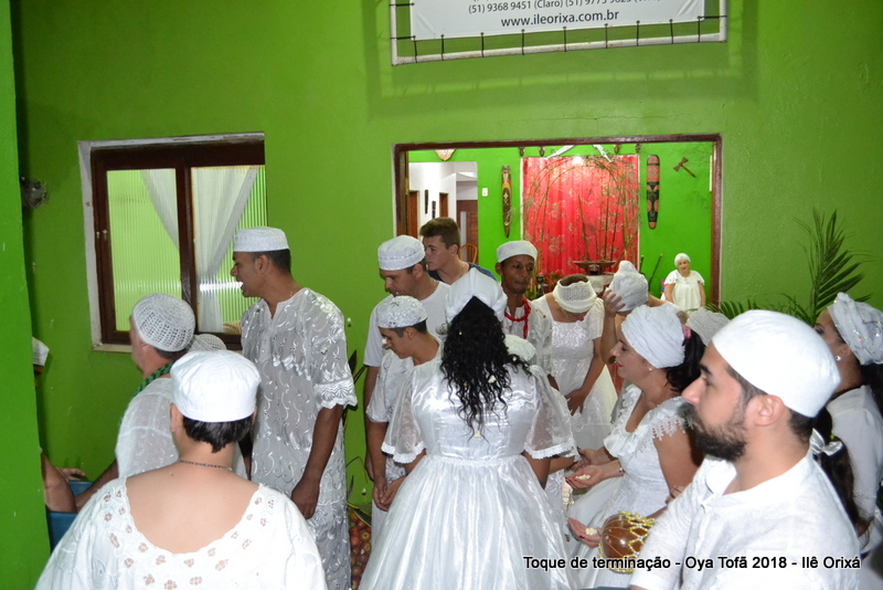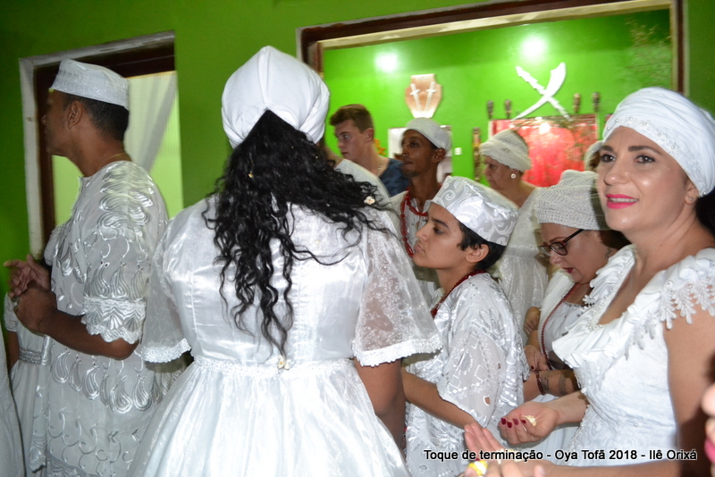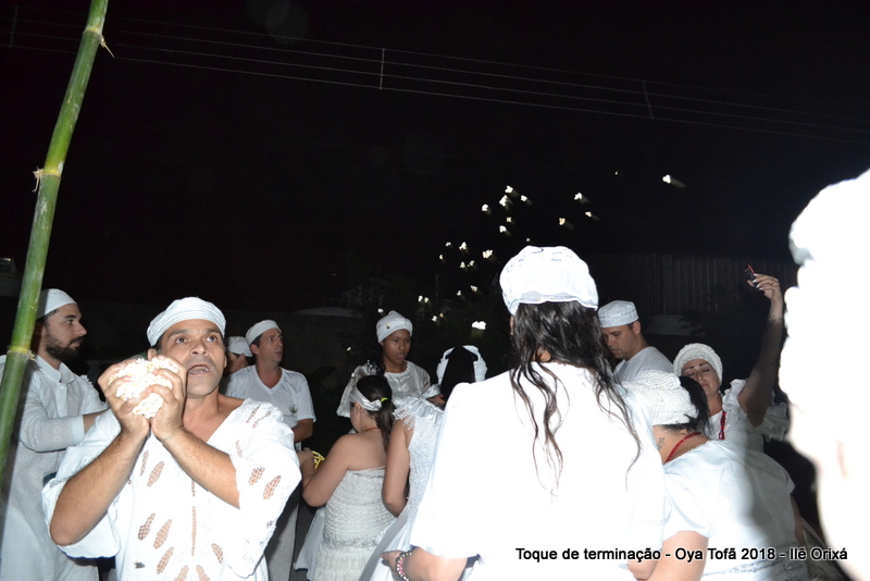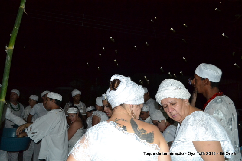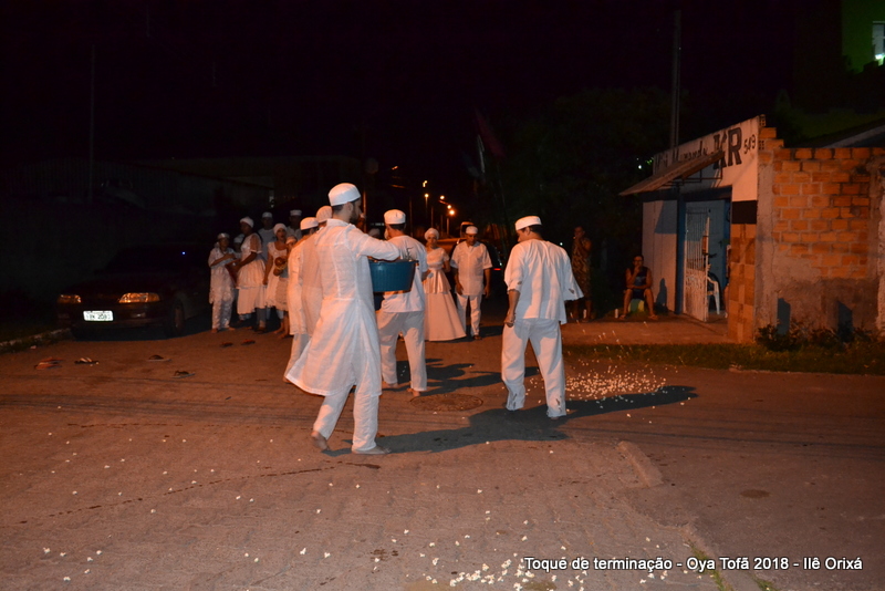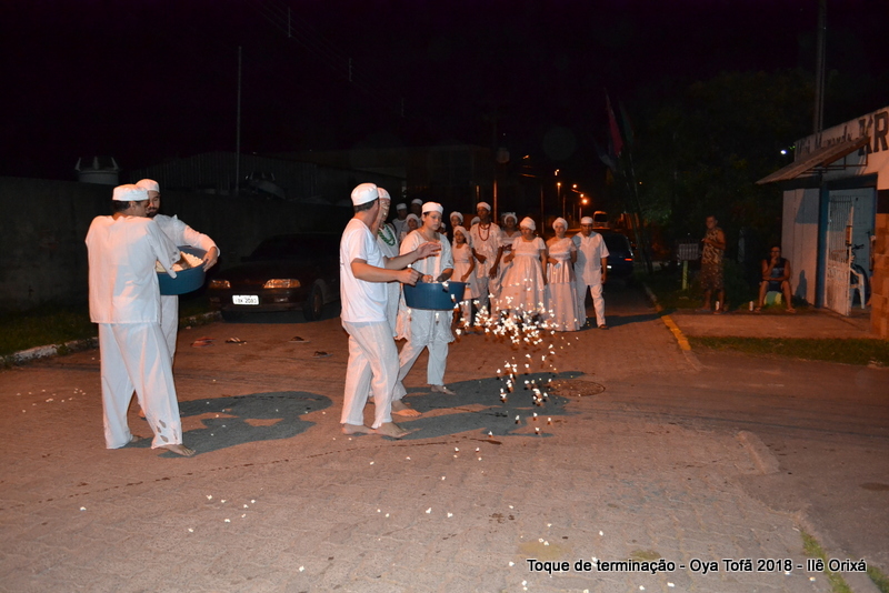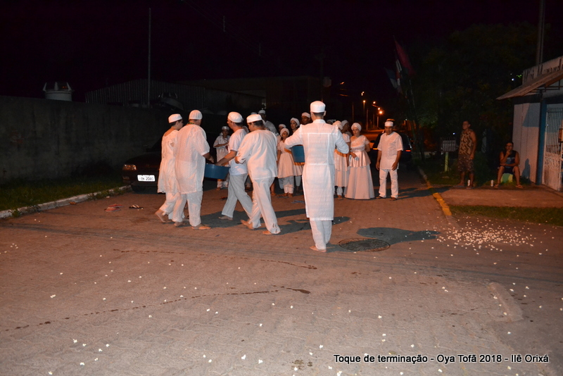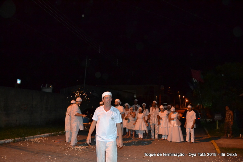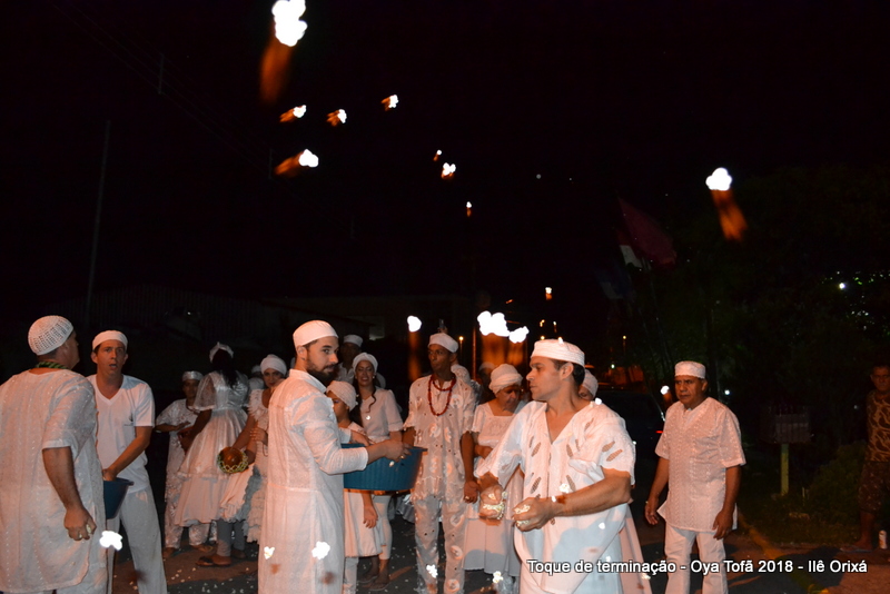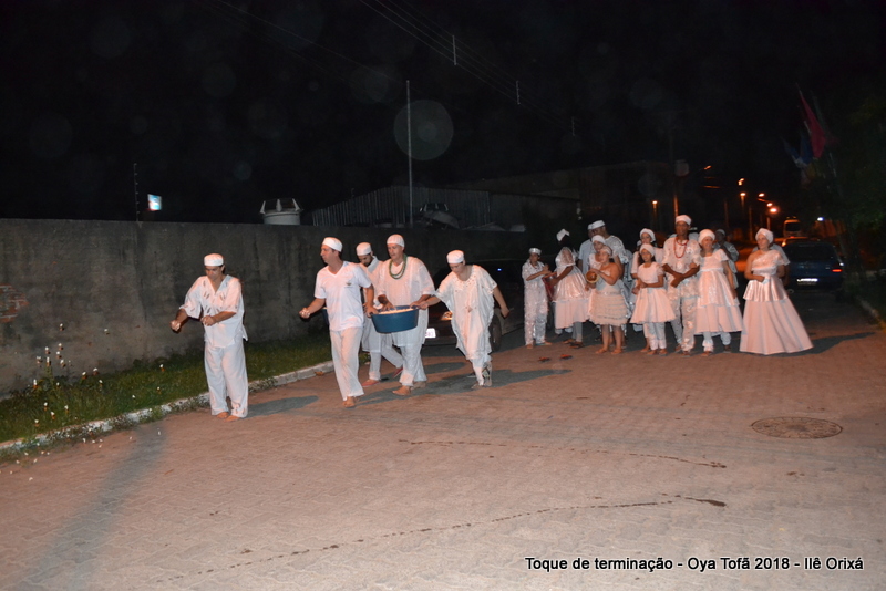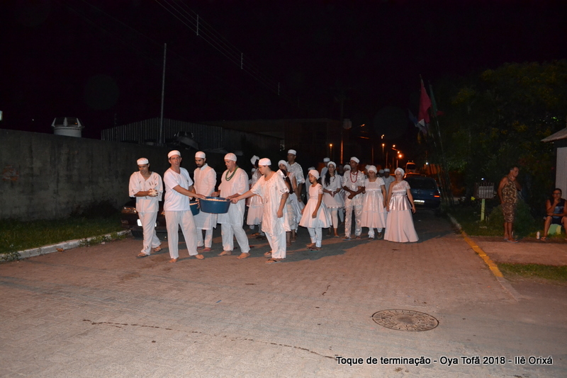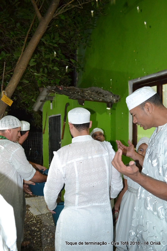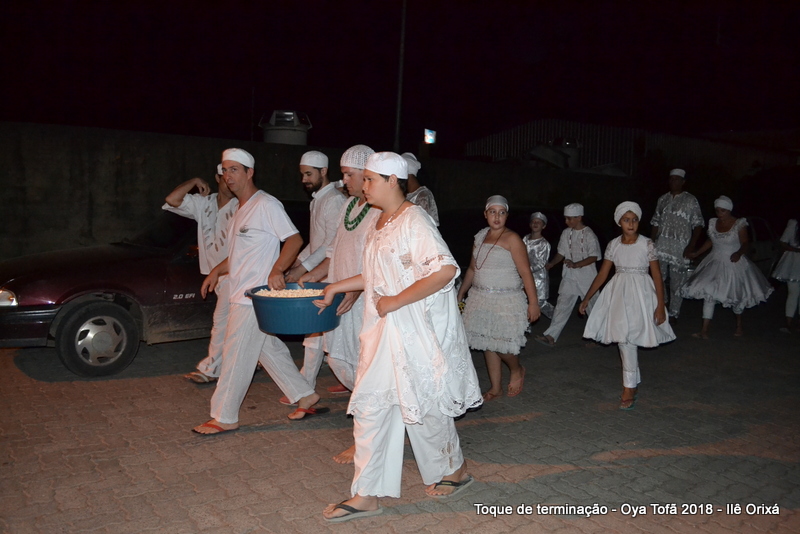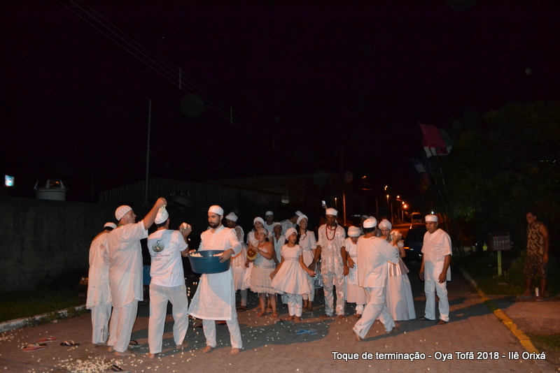 Todos de branco, prontos para o início da cerimônia do toque de terminação, na noite do dia 7 de abril foram até a rua para fazer reverências ao orixá Bará, para além de agradecer, pedir axé de prosperidade, alegrias e conquistas a todos. Bará é o orixá responsável pelos caminhos, é quem determina quando serão abertos e também quando serão fechados.