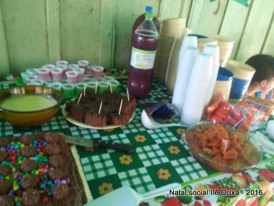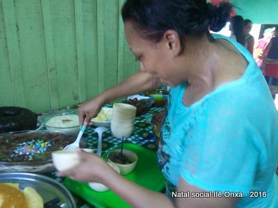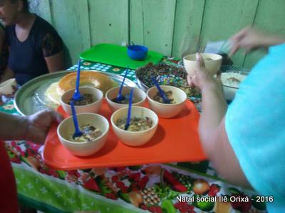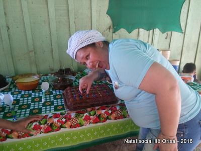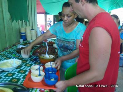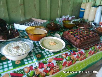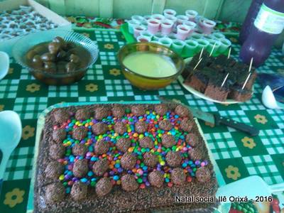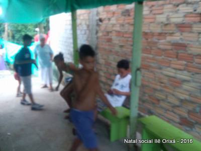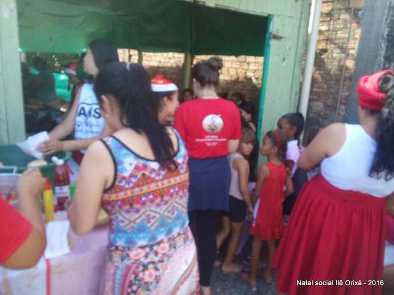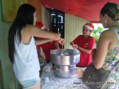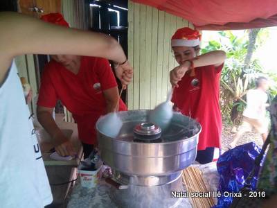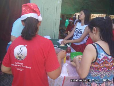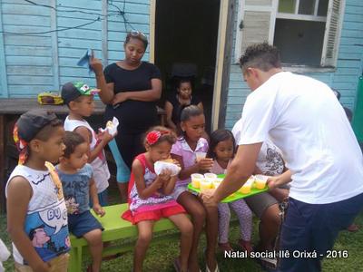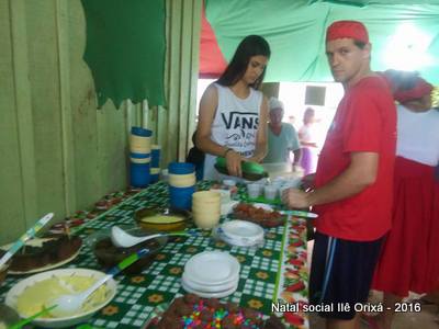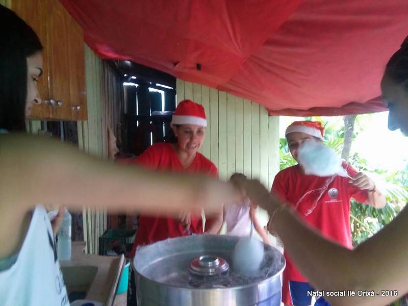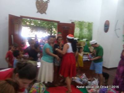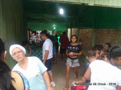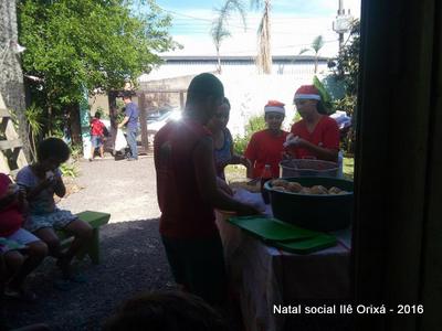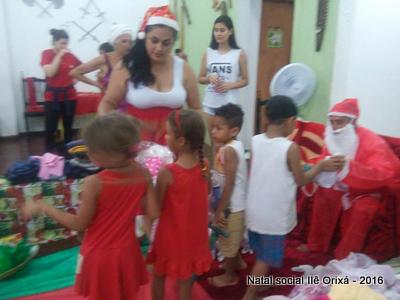 Foi uma tarde quente onde as crianças foram inicialmente servidas com cachoro quente, refrigerante e suco, além de doces diversos e algodão doce, que fizeram com que a tarde fosse ótima para todas as crianças que estavam presentes na festa de natal, regida com alegria estanpada em cada criança que estava presente. Logo após o lanche todas as crianças foram servidas e então foi realizada a chegada do Papai Noel, no salão dos orixás, onde todas as crianças receberam brinquedos e doces para para levarem para suas casas.