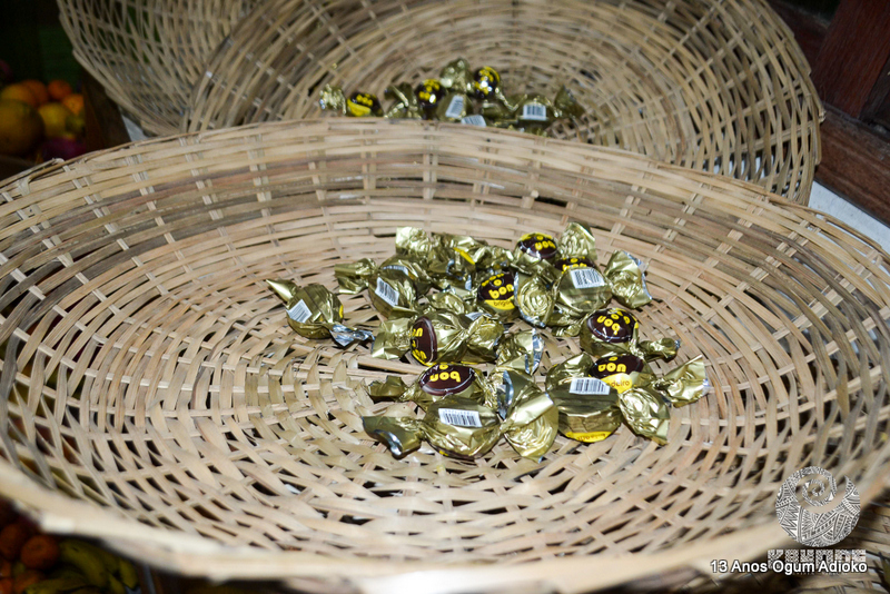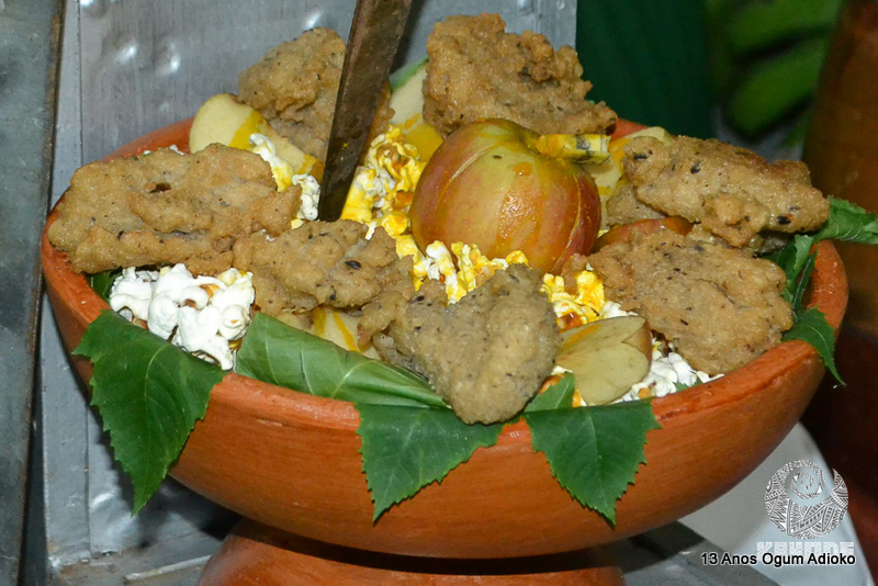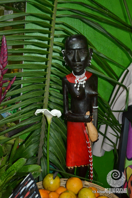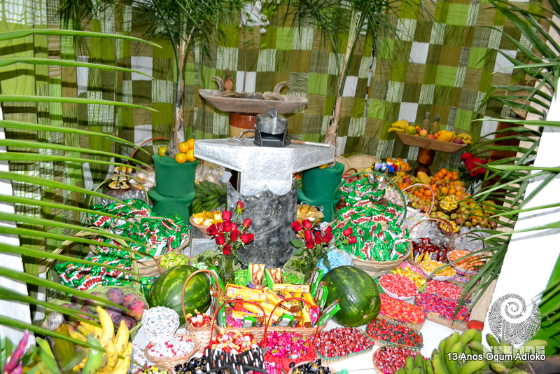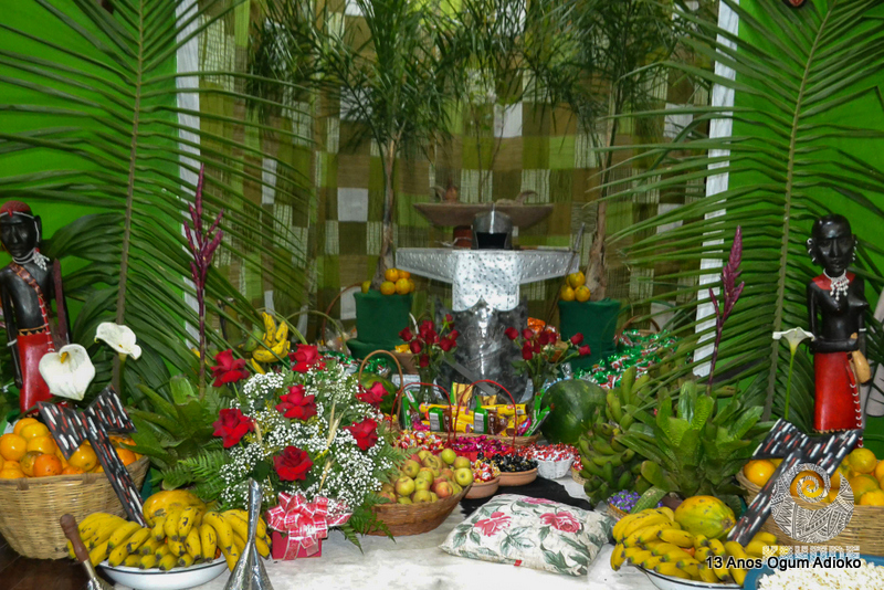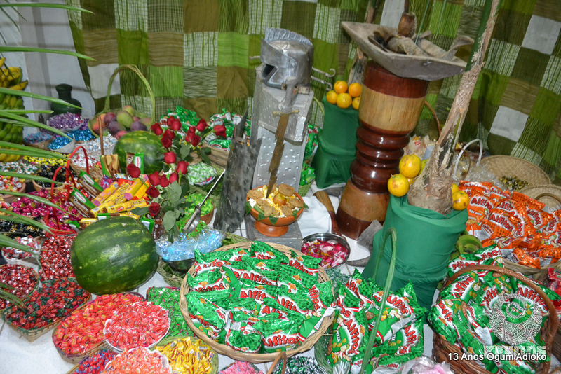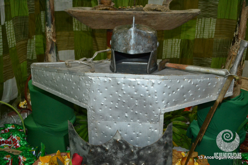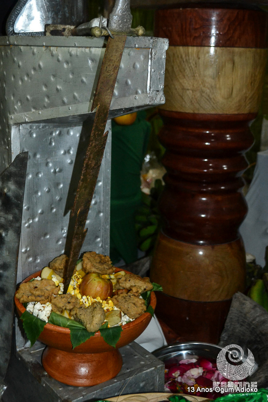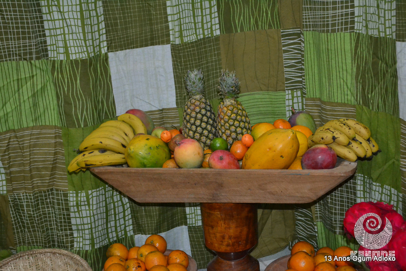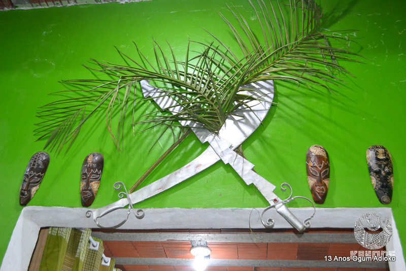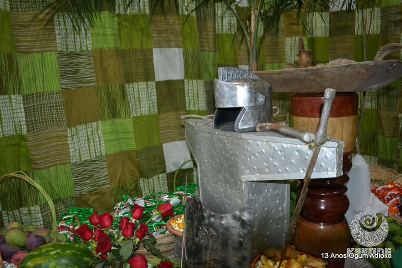 Em destaque sempre no centro uma gamela com frutas, que representa a origem do axé recebido de Xangô Aloxé, bacia religiosa de Pai Alexandre e de Pai Ronie, e na entrada do quarto de santo folhas de palmeiras, representam o mariwo (folhas de palmeiras desfiadas), que na África são utilizados como vestimenta para Ogum.
