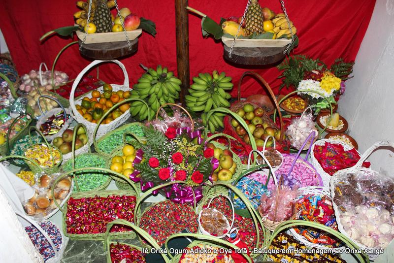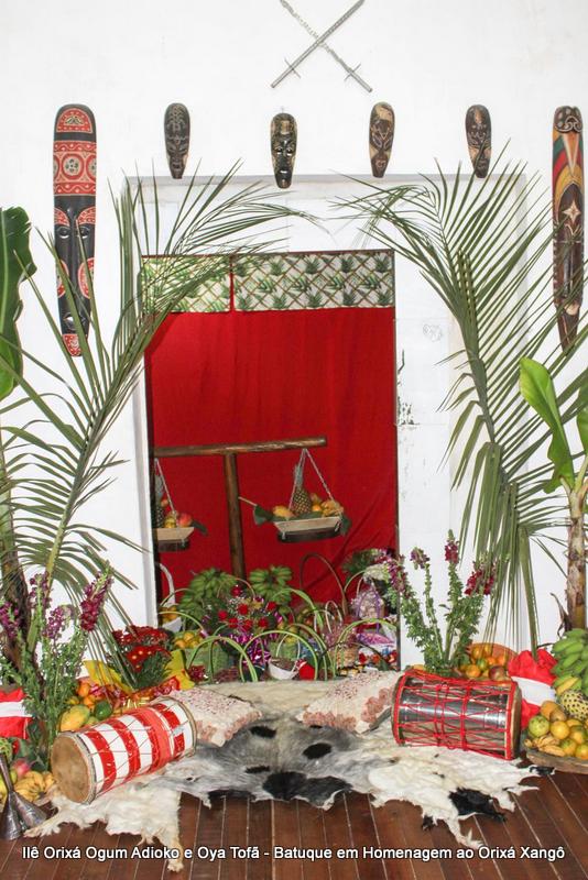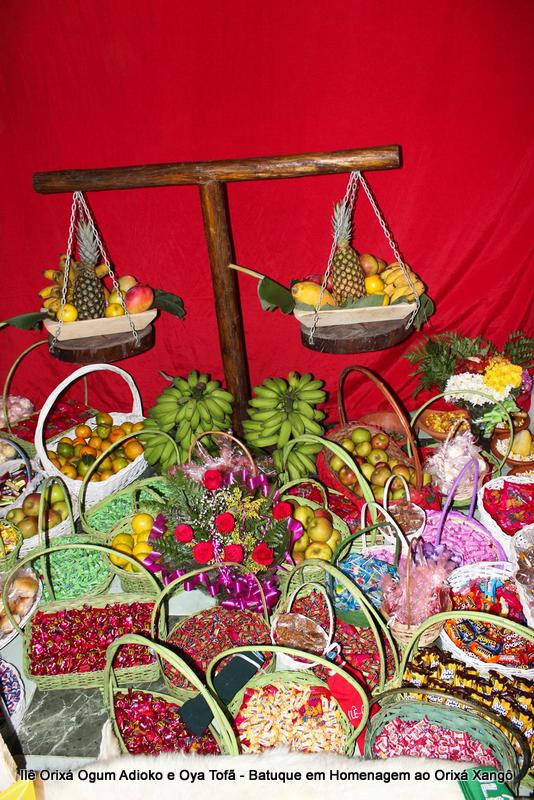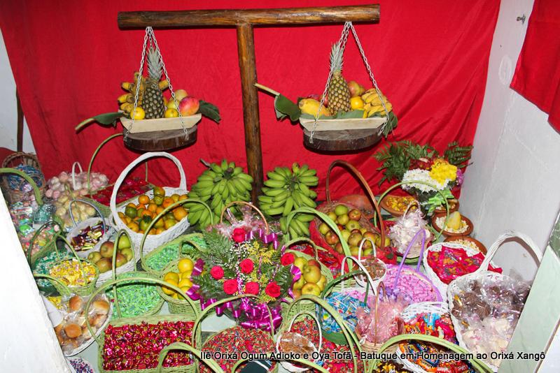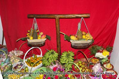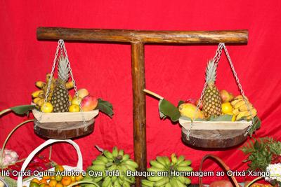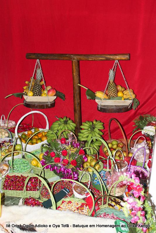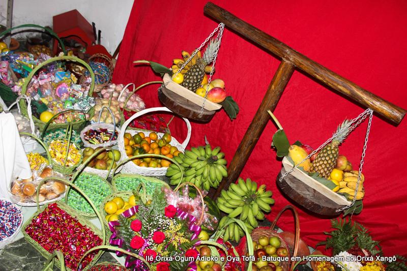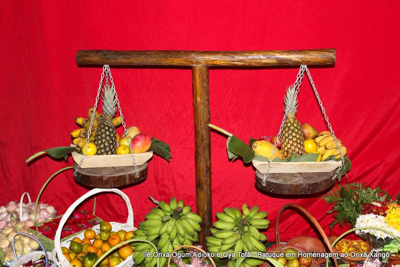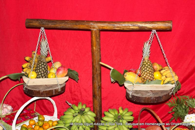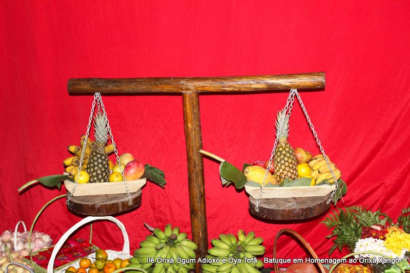 A decoração dentro do peji contou com a balança em madeira com gamelas decoradas com frutas, representando o equilíbrio de Xangô, a justiça e a serenidade.