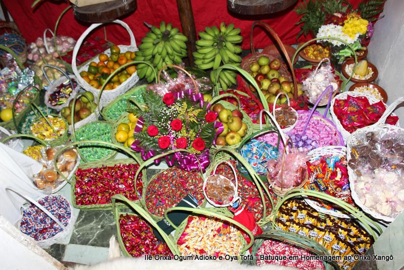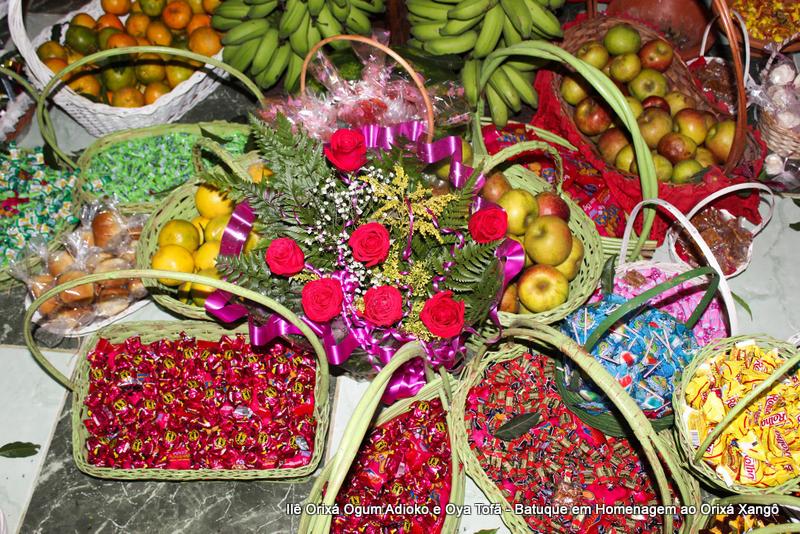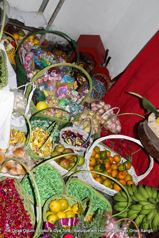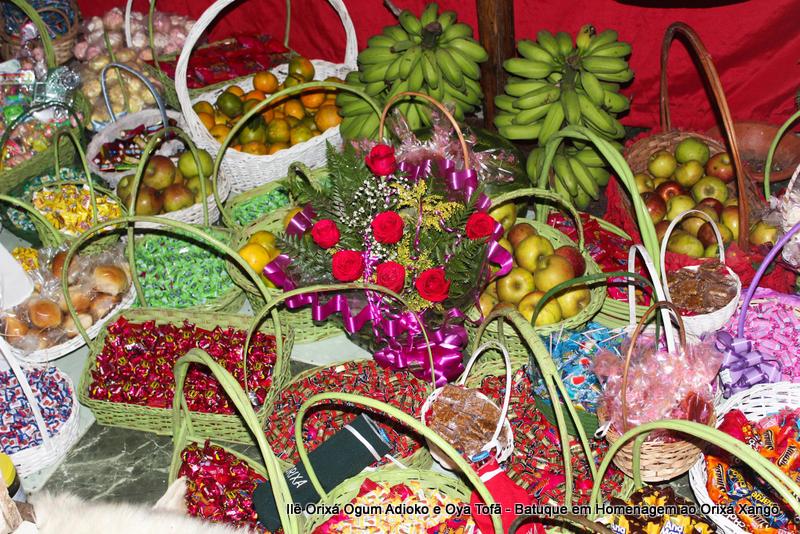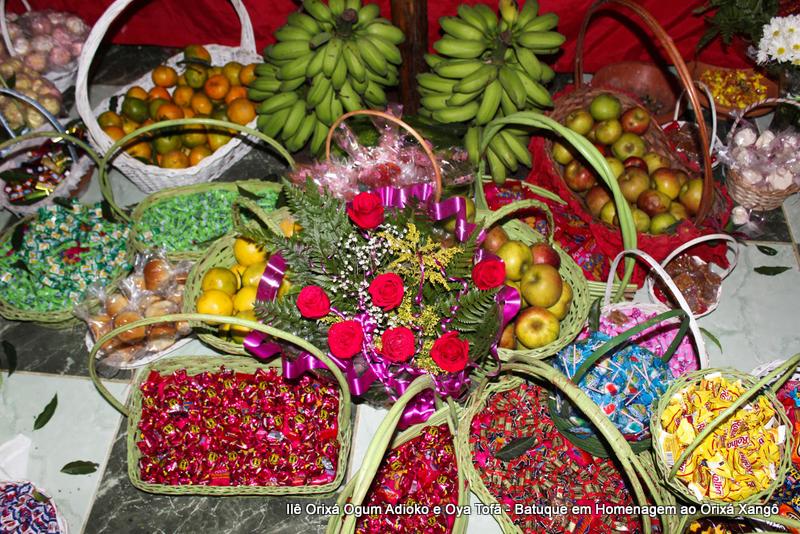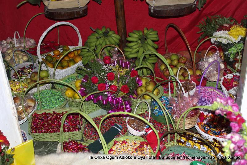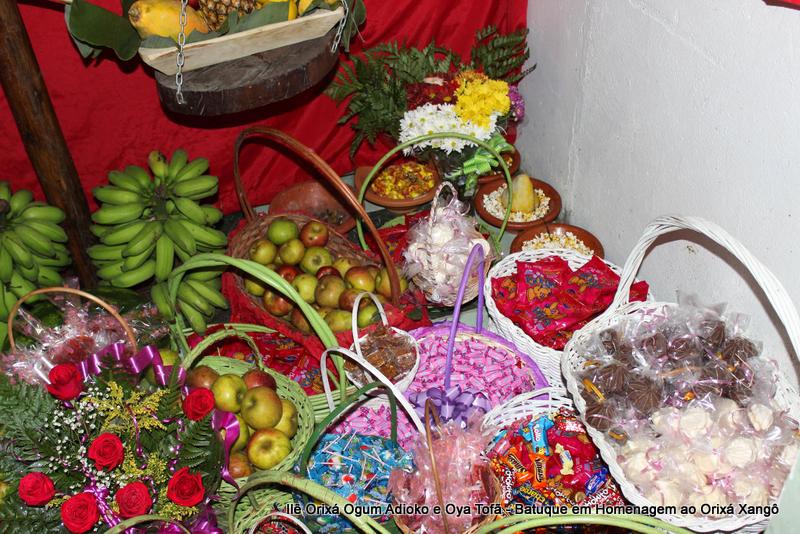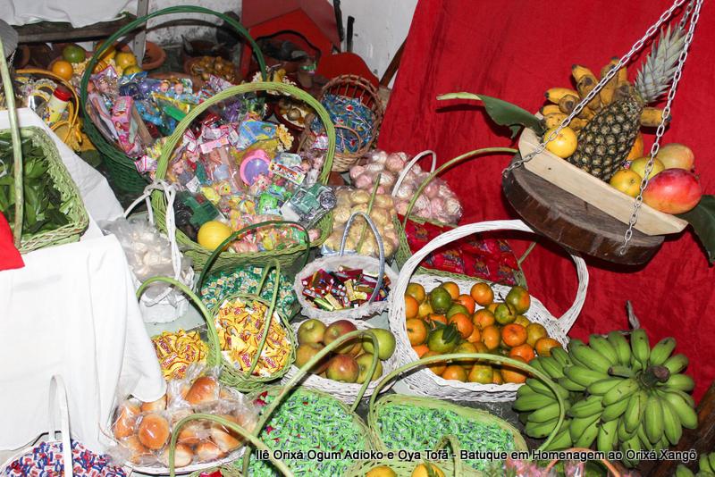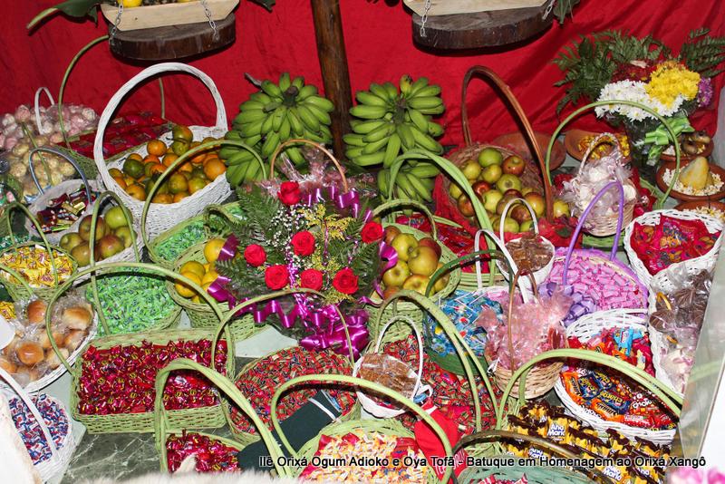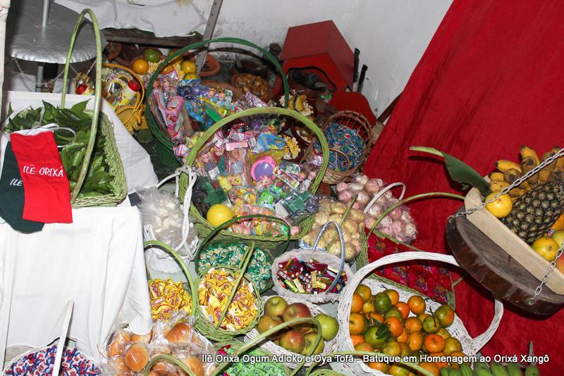 A decoração dentro do peji contou com a balança em madeira com gamelas decoradas com frutas, representando o equilíbrio de Xangô, a justiça e a serenidade.