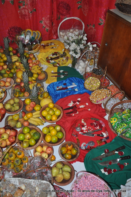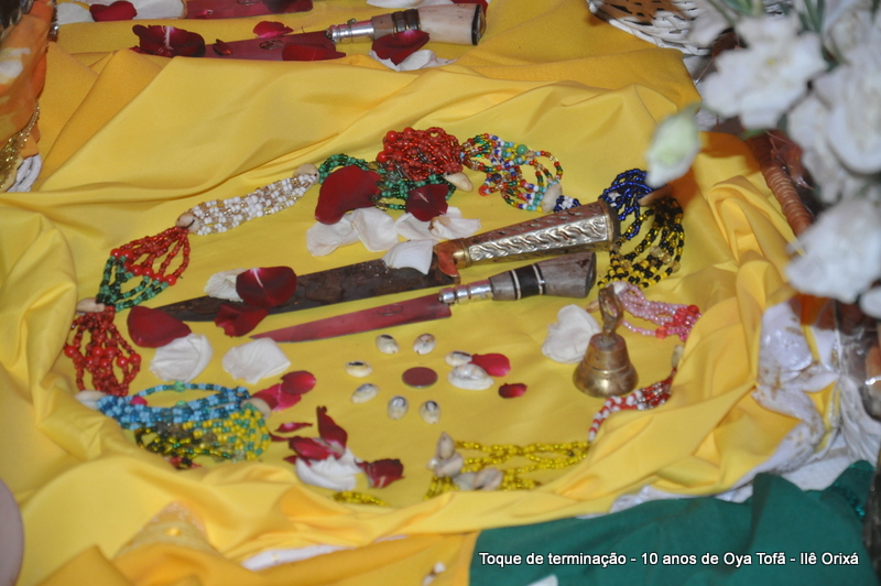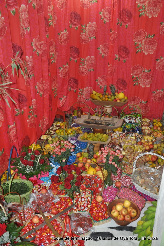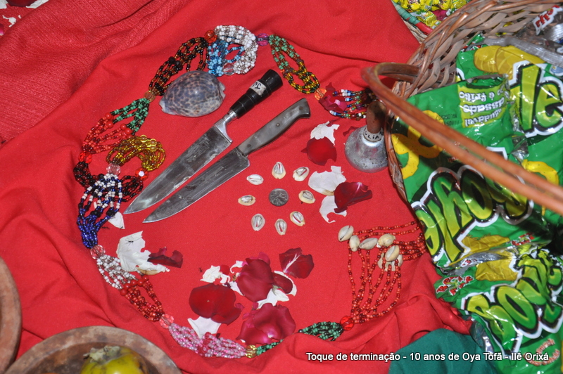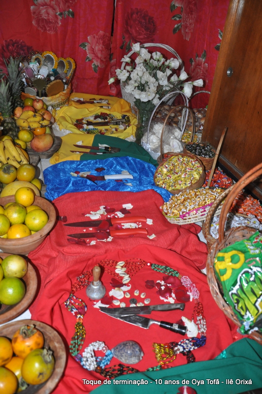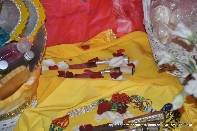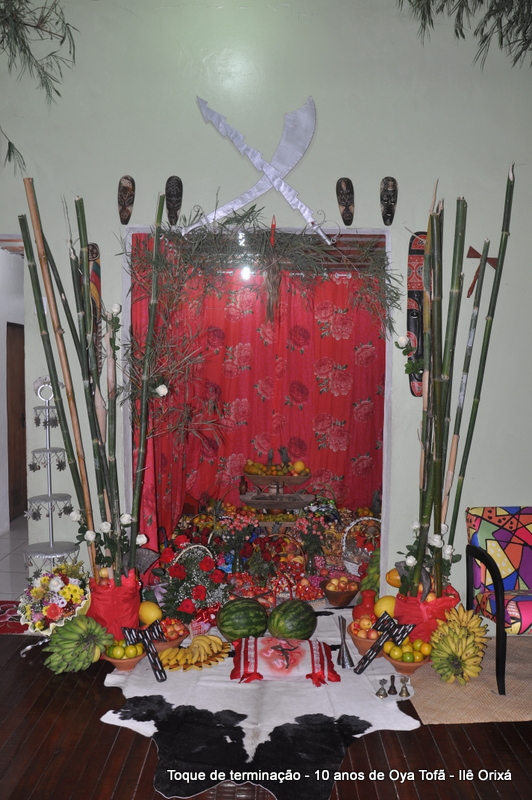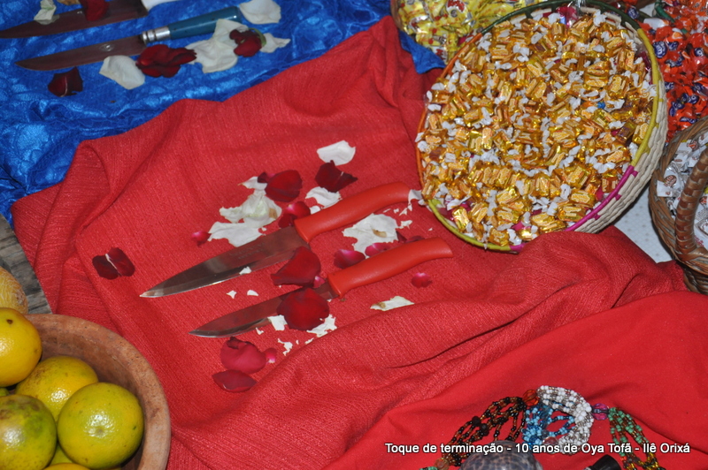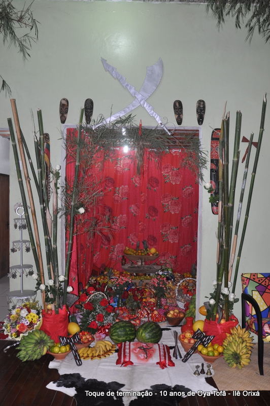 O quarto de santo foi preparado para o toque de terminação e entrega de axés dos primeiros filhos de Pai Alexandre de Oya Tofã a receberem axés, o esperado por muitos era uma decoração em branco, mas foi o vermelho de Oya que prevaleceu em toda a decoração, seja pela cor dos doces, das frutas ou adornos que estavam presentes. O branco ficou restrito as roupas dos amigos e filhos, além de paredes do Ilê. O branco estava no coração de cada um que vê na religião dos orixás apenas formas de levar harmonia, paz de fazer o bem, ajudar e melhorar a vida de cada um que possui contato com a religião dos orixás.