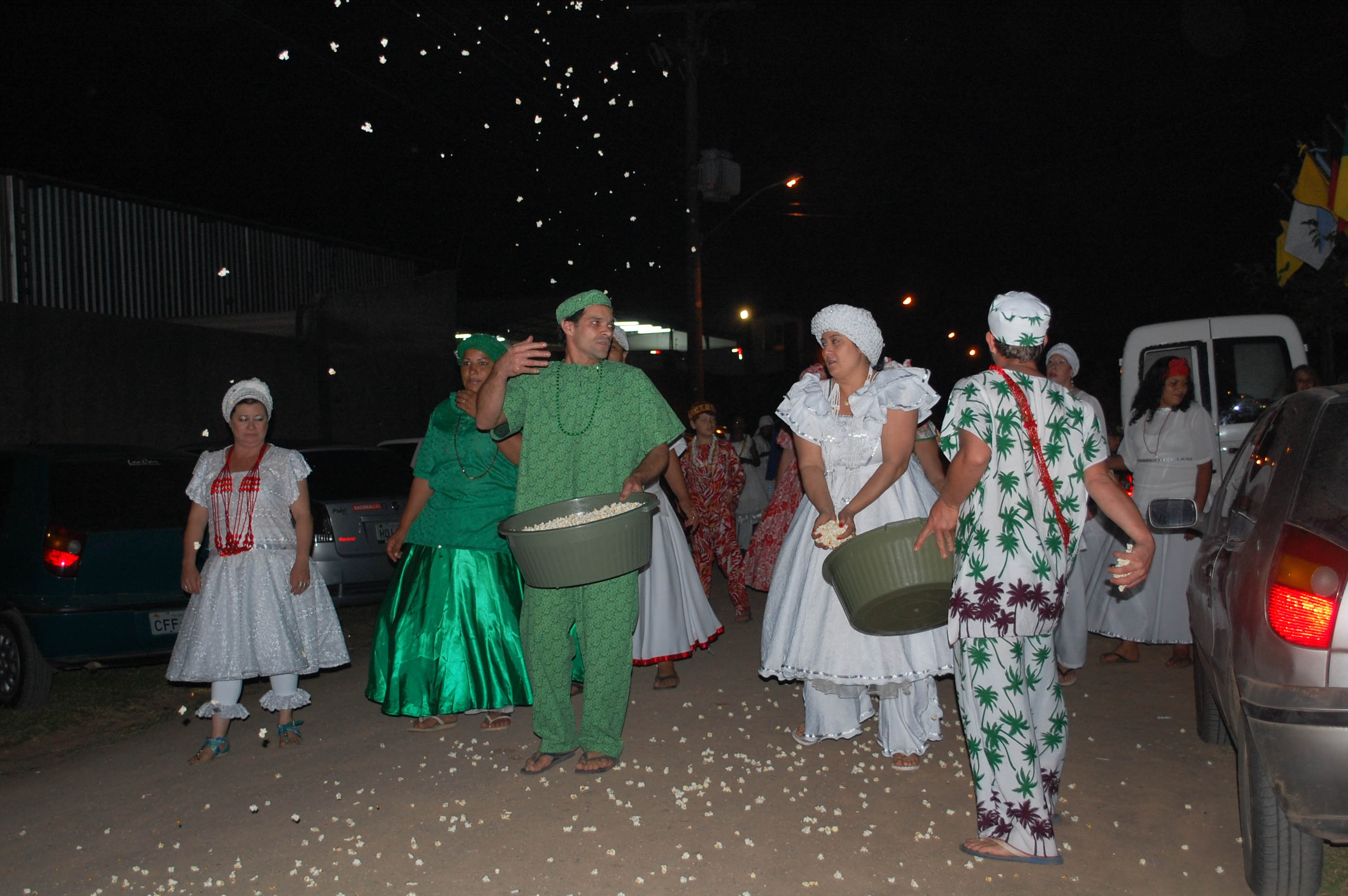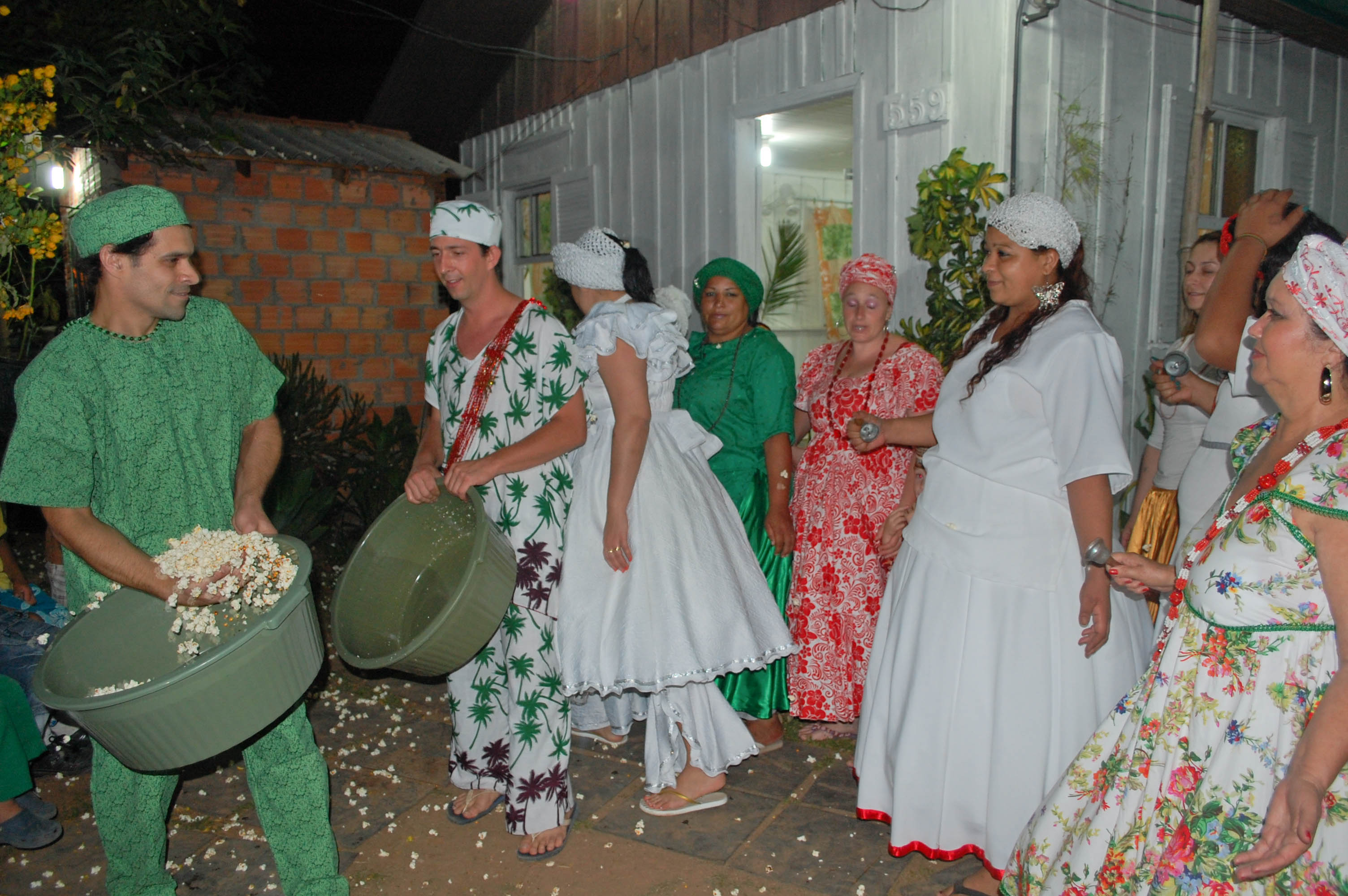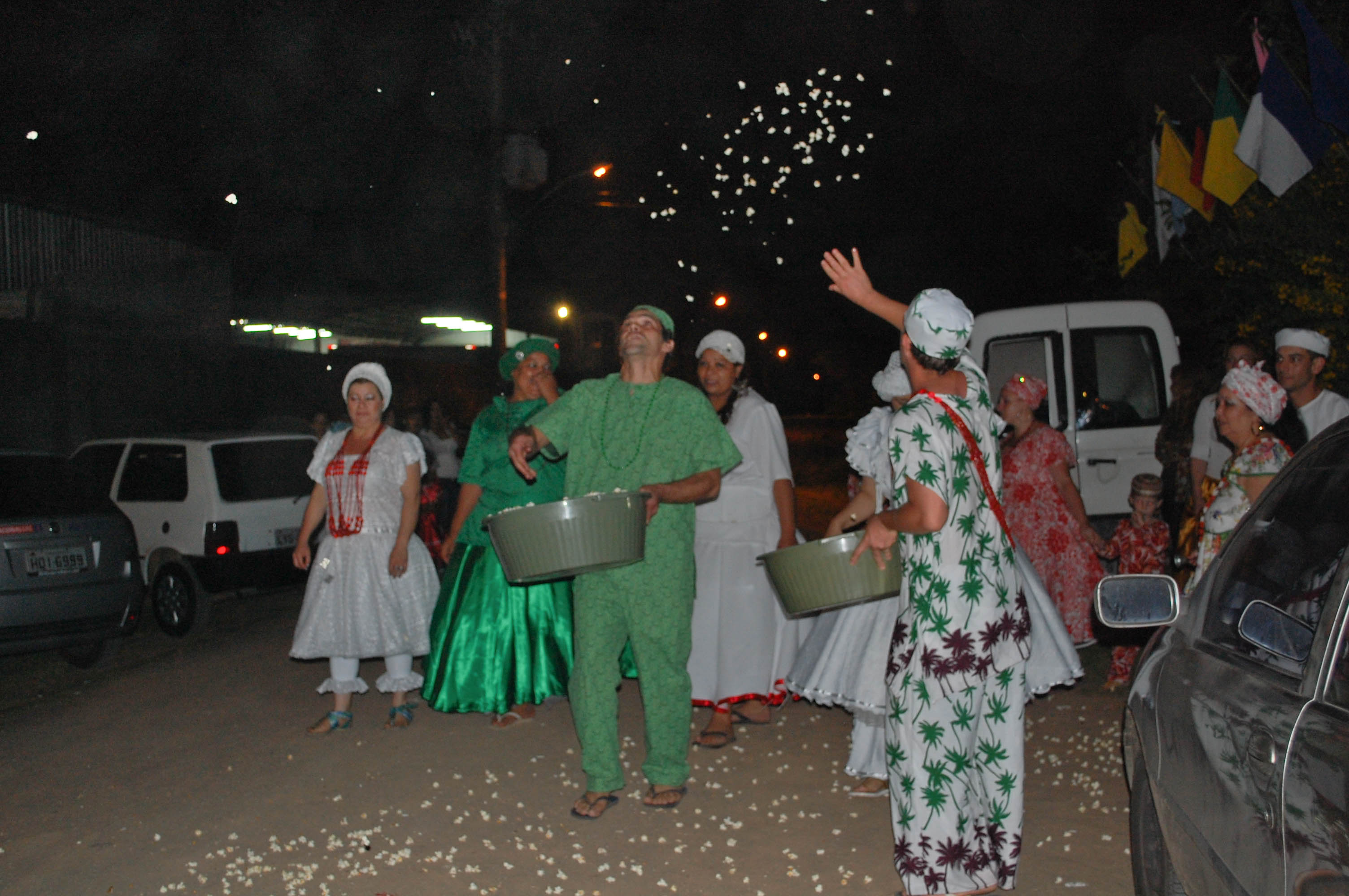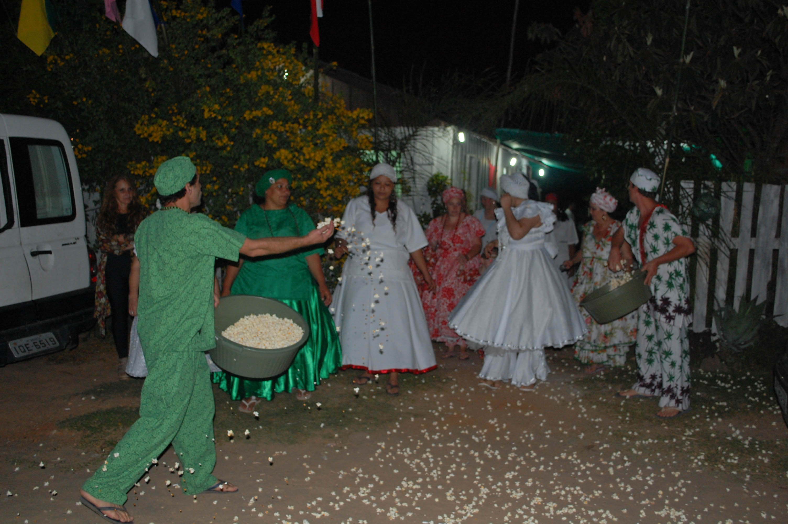 Para saudar o Orixá Bará foram utilizadas duas bacias de pipoca que serviram para abrir o ritual no cruzeiro e realizar um chuveiro de pipoca em todos que estavam presentes no local.