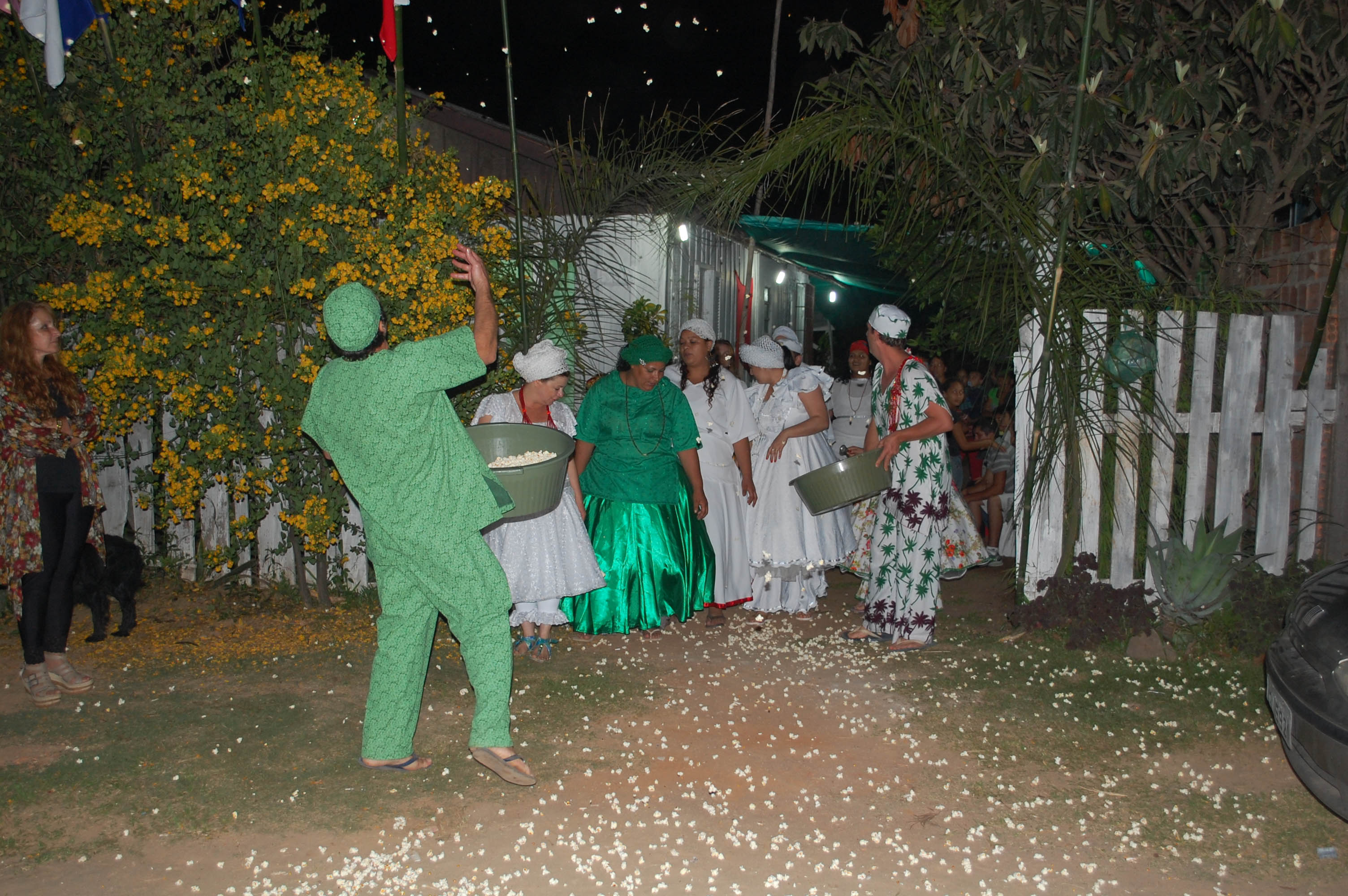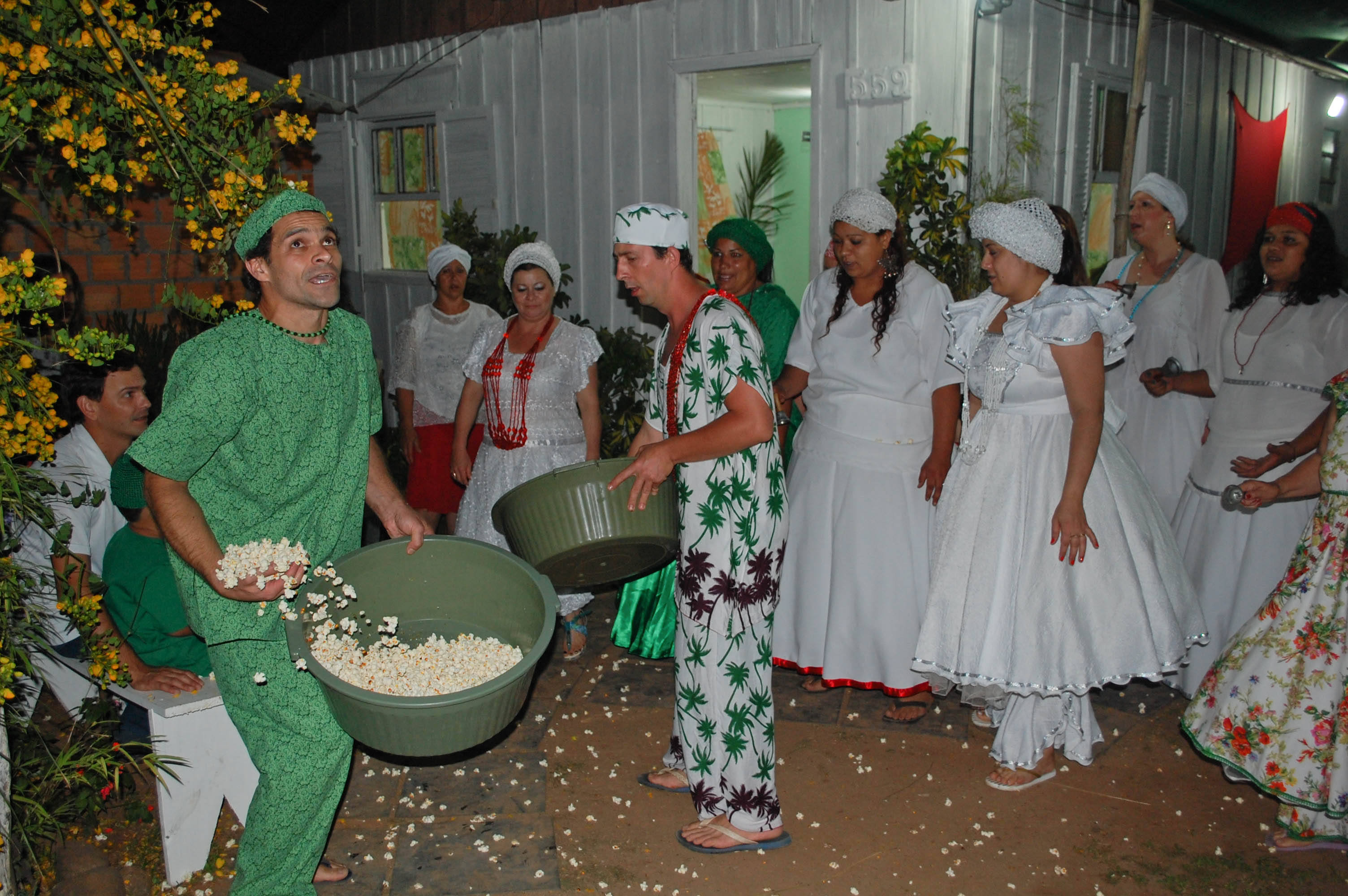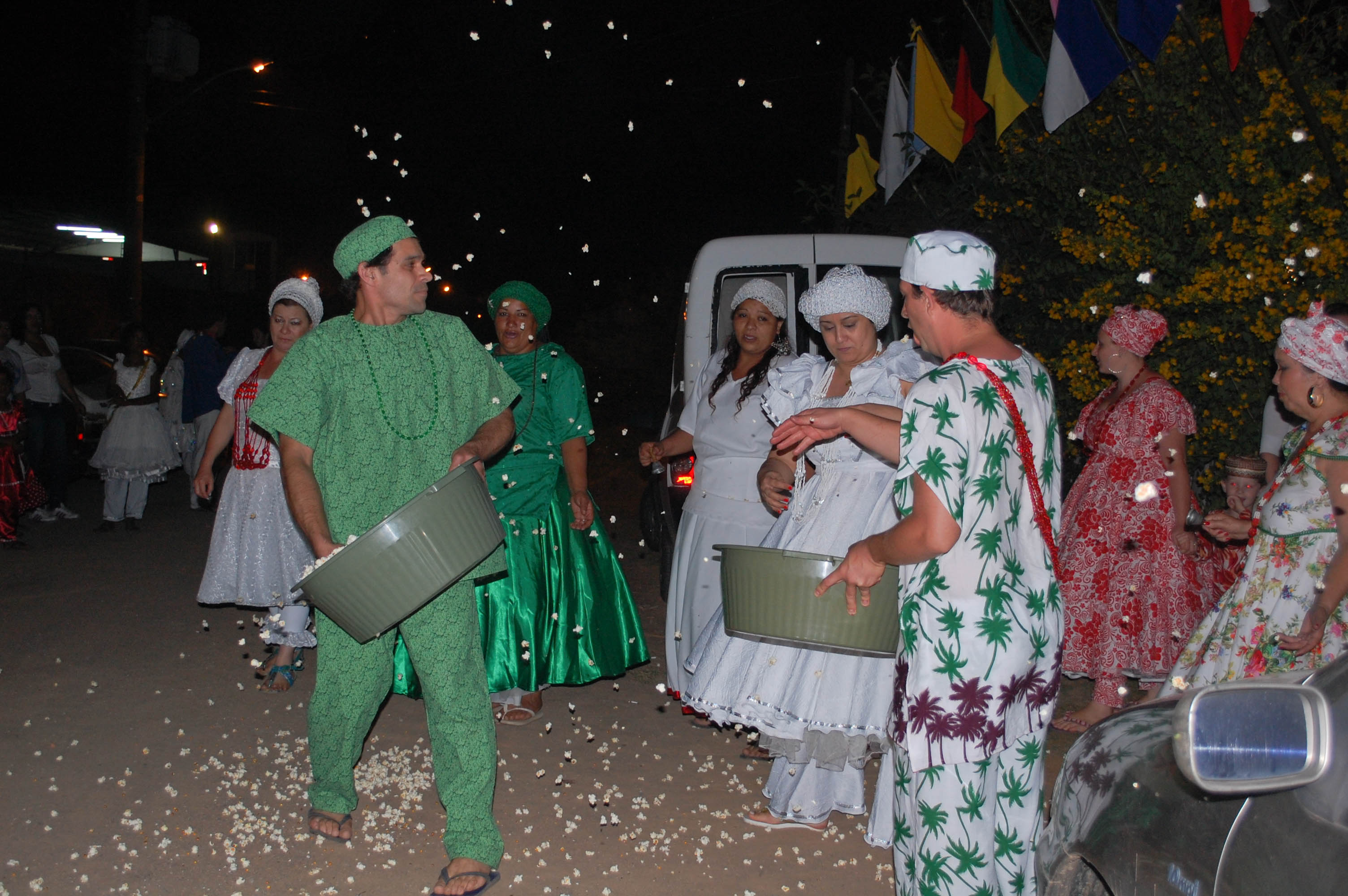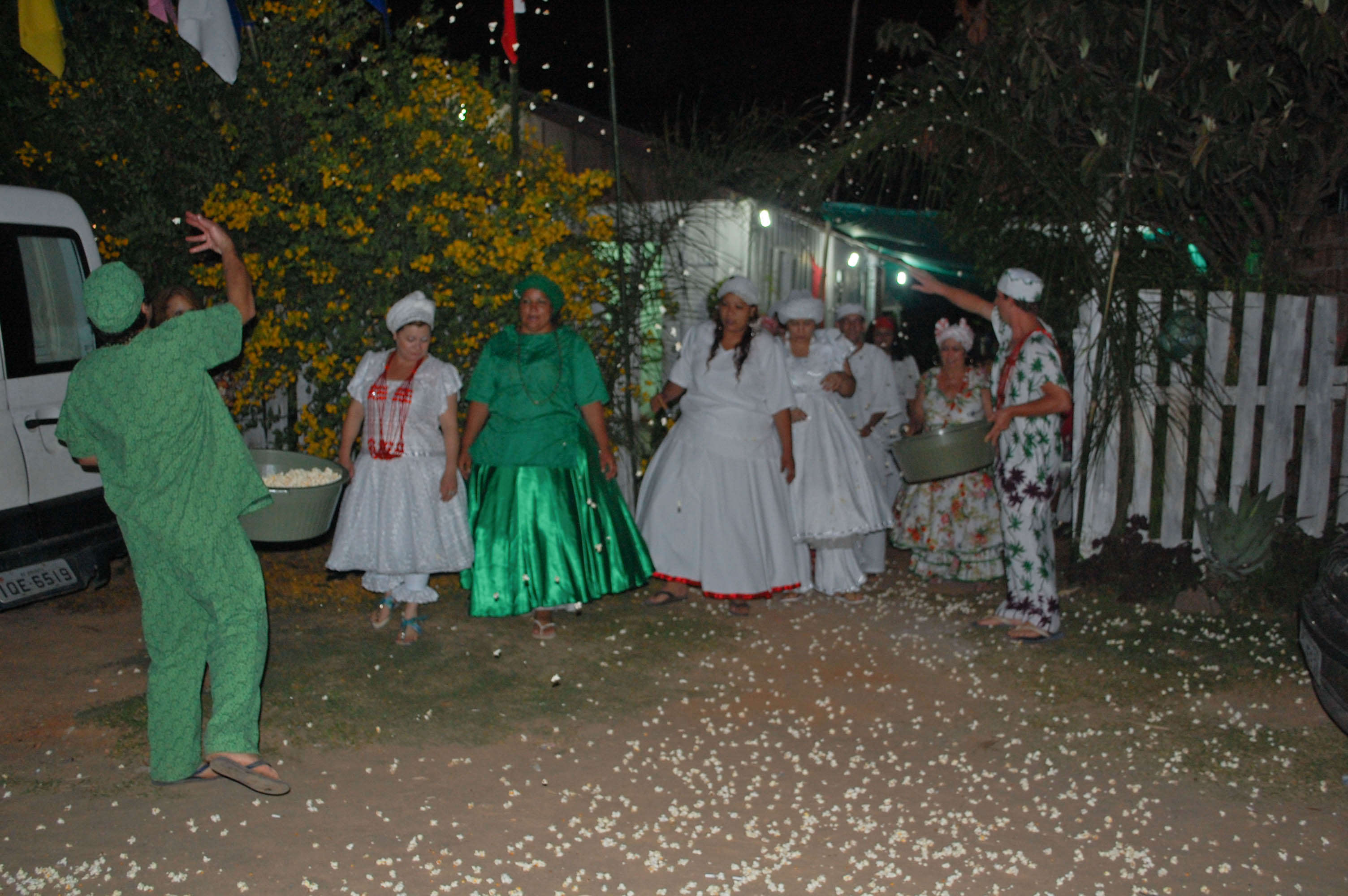 Para saudar o Orixá Bará foram utilizadas duas bacias de pipoca que serviram para abrir o ritual no cruzeiro e realizar um chuveiro de pipoca em todos que estavam presentes no local.