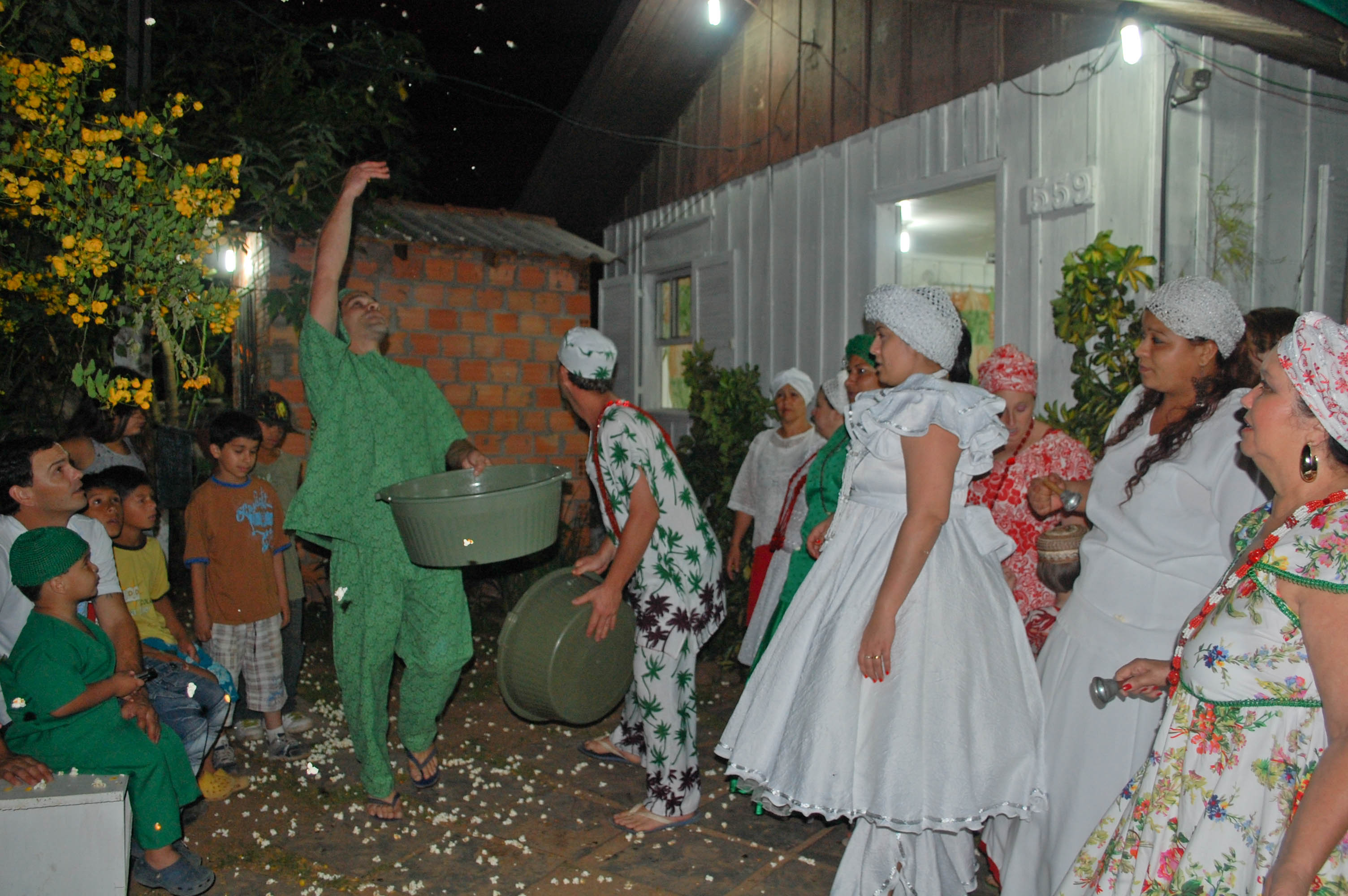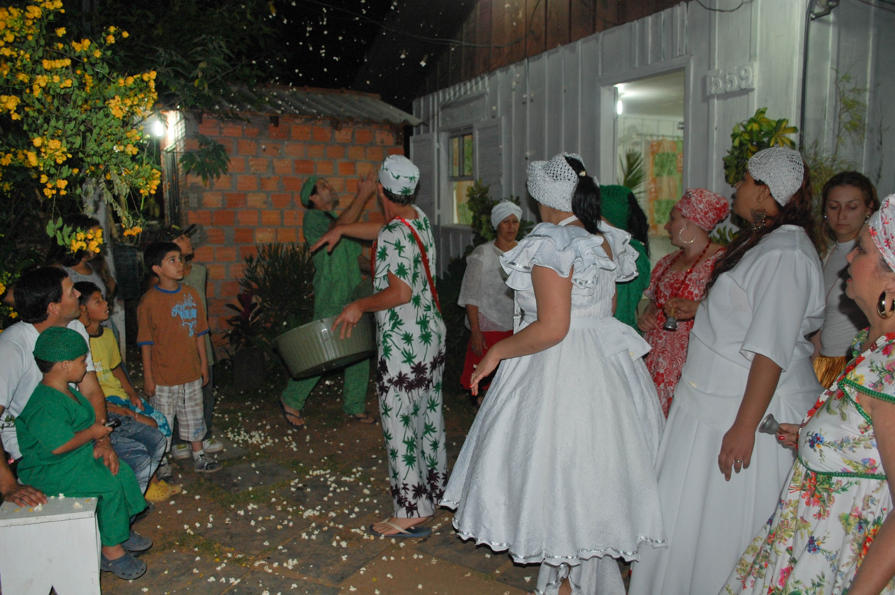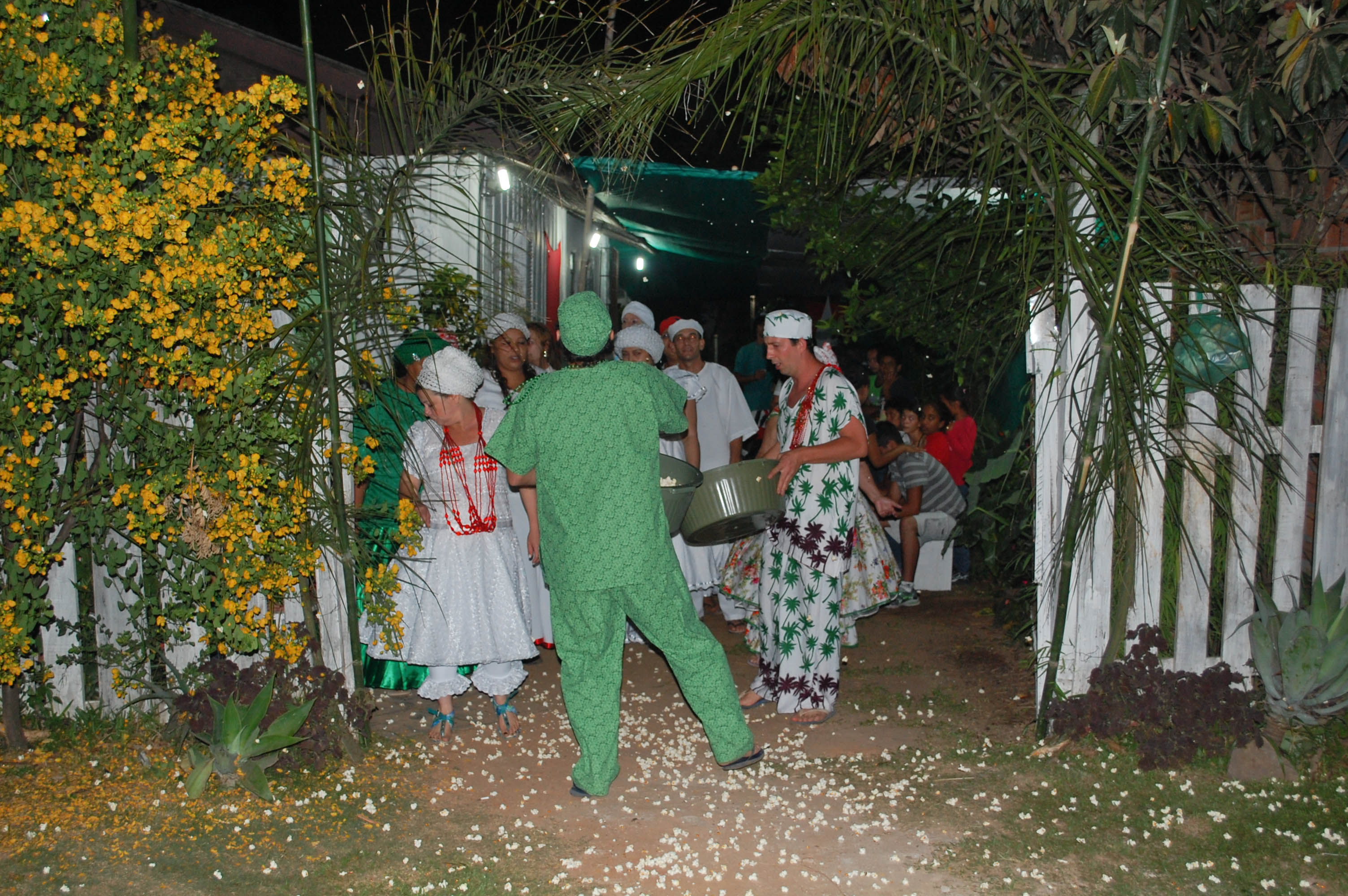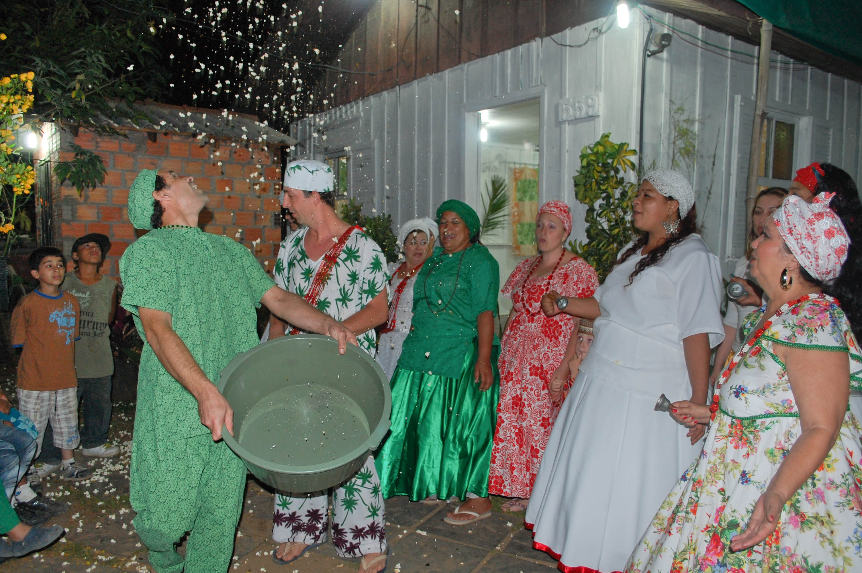 Para saudar o Orixá Bará foram utilizadas duas bacias de pipoca que serviram para abrir o ritual no cruzeiro e realizar um chuveiro de pipoca em todos que estavam presentes no local.