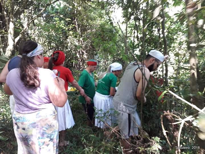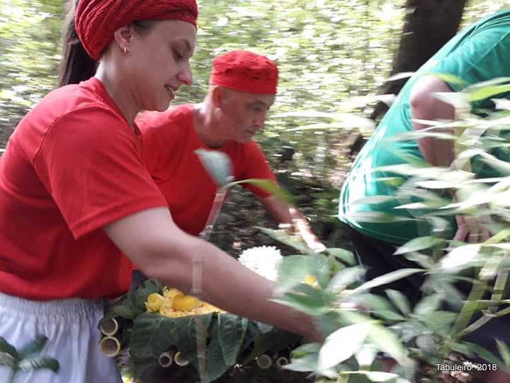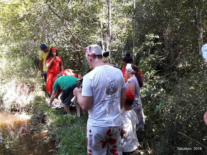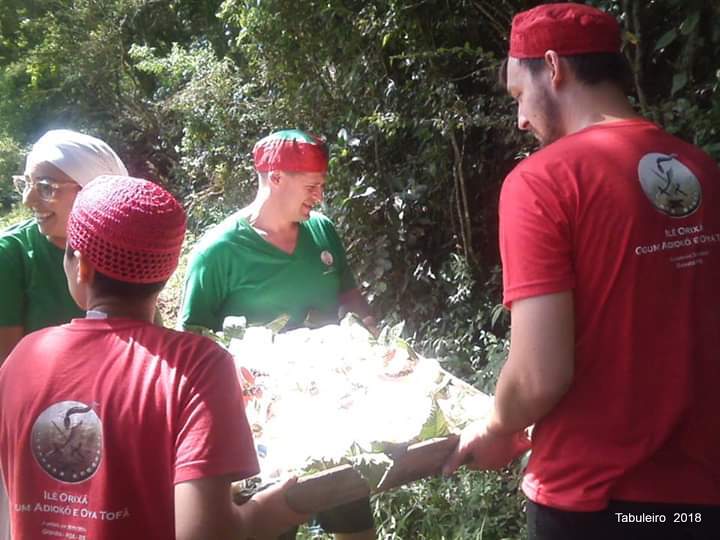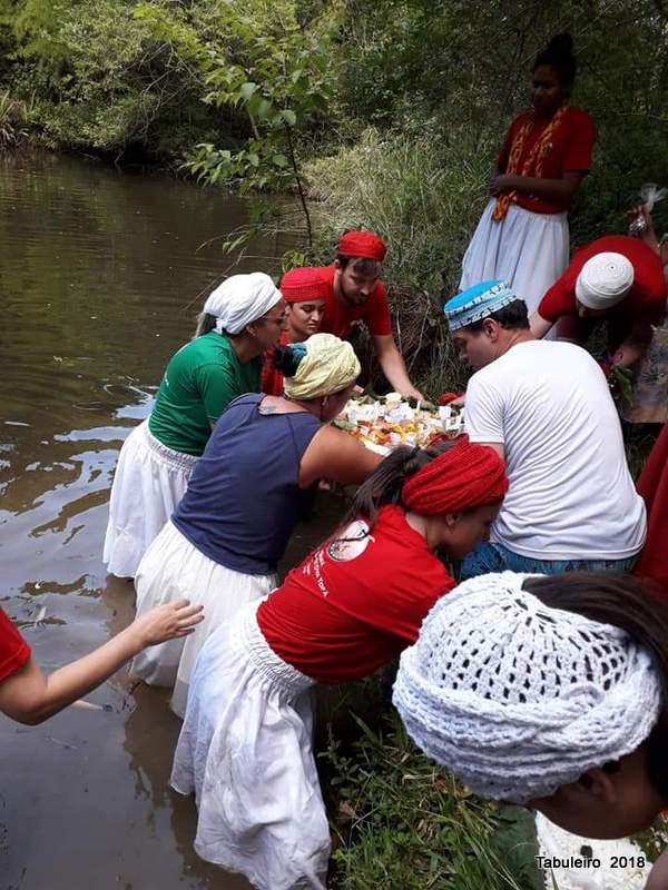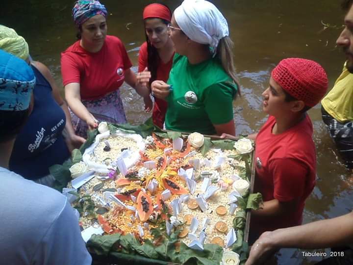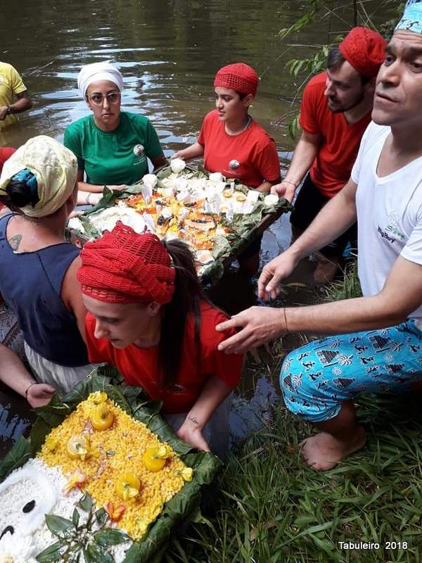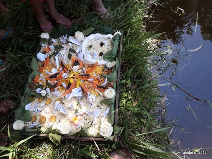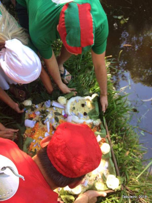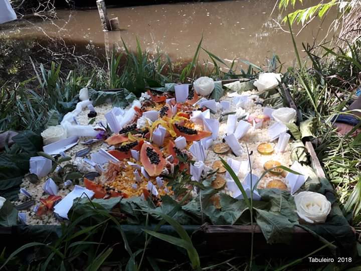 Para a construção do tabuleiro são utilizados somente materiais biodegradáveis e o suporte é produzido em madeira que após alguns dias é retirado da água, evitando gerar poluentes para o local. Na ocasião além do tabuleiro foi entregue também na mata axé para Oya e Ogum.
